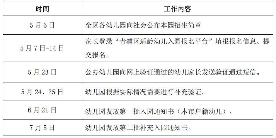 5月8日—12日 | 家长登录“青浦区适龄幼儿入园报名平台”填报报名信息、提交报名。 |