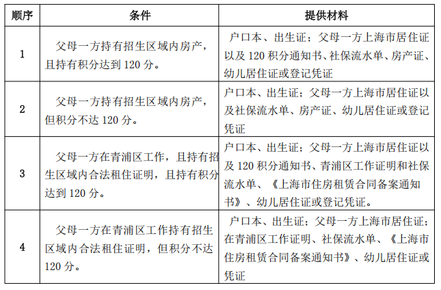 1 | 父母一方持有招生区域内房产,且持有积分达到120分。 | 户口本、出生证;父母一方上海市居住证以及120积分通知书、社保流水单、房产证 、幼儿居住证或登记凭证 |