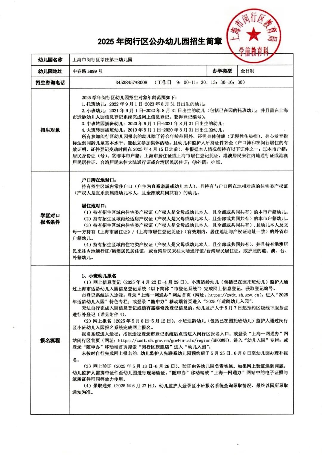 2021年闵行区莘庄第三幼儿园小班幼儿 招生简章