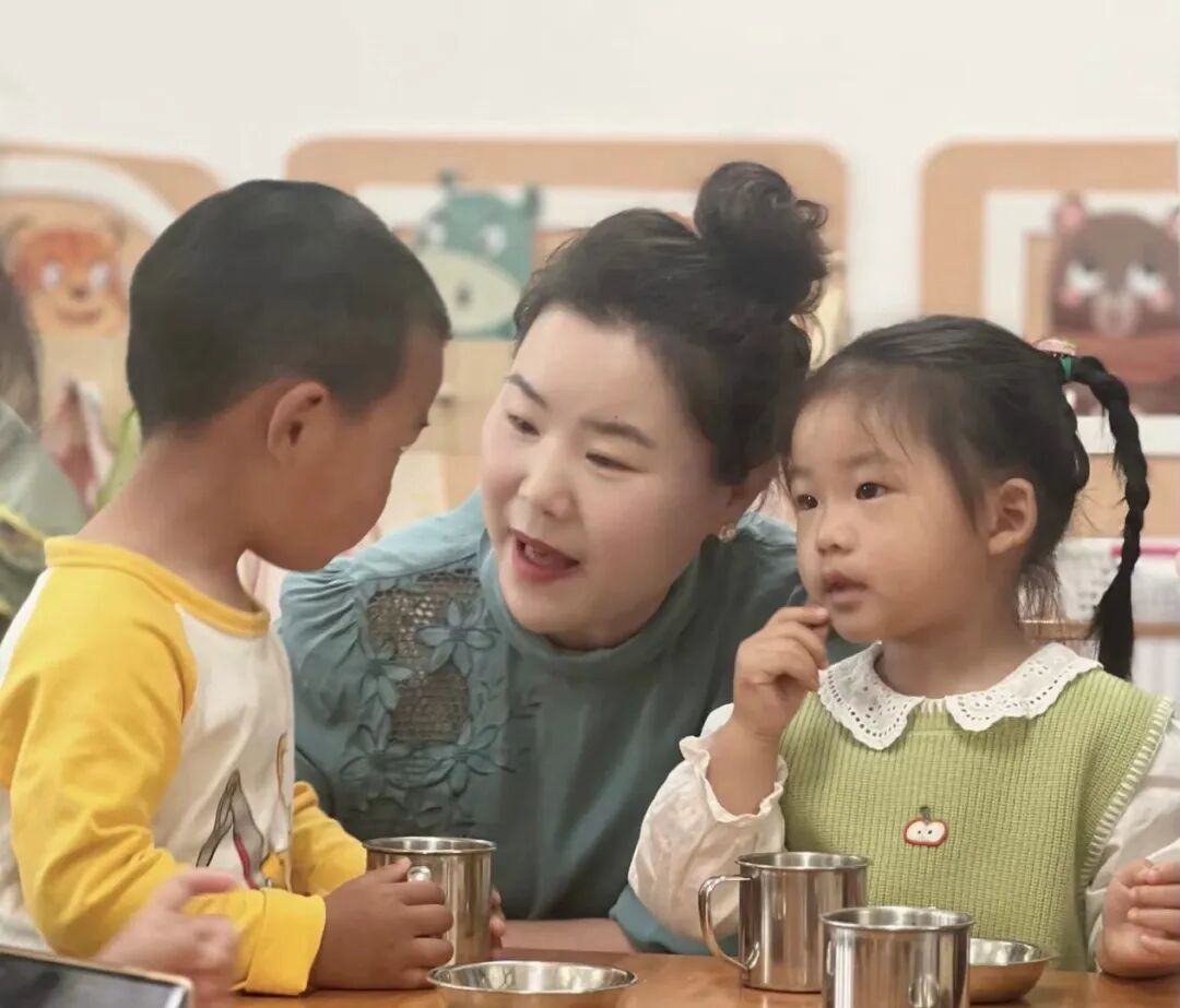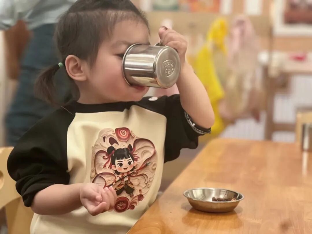 生活体验时段,洗手池前萌娃认真模仿“七步洗手法”,点心桌旁有序品尝饼干与牛奶,教师轻声引导“一口饼干一口牛奶”,细节中渗透生活教育。