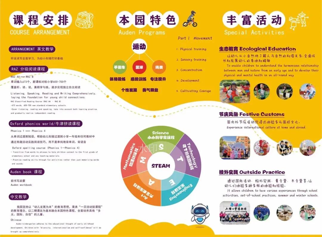 欧顿锦绣幼儿园以全球先进、科学合理的教育理念、显著的教学成果,赢得了良好的社会声誉,以及海内外家长的认可。为了满足社会、家长对幼儿教育的不同层次的需求,园内以2-6岁的幼儿为主要招生对象,除了开设托班特色教学,招收2岁以上的中外儿童,还较出色地完成了中大班幼儿的幼小衔接,每年部分毕业生会进入协和、上中国际部、世外小学、七宝实验等知名学校。 园内秉持全人培养的理念,一方面,用心打造双语教学环境,既有外教英语全天沉浸式陪伴,又重视中教汉语的学习; 通过运动、生活、学习、游戏,旨在发展幼儿空间及肢体运动能力等多元智能,培养终身学习的思维和习惯,这为幼儿未来的成长打下良好的基础。
