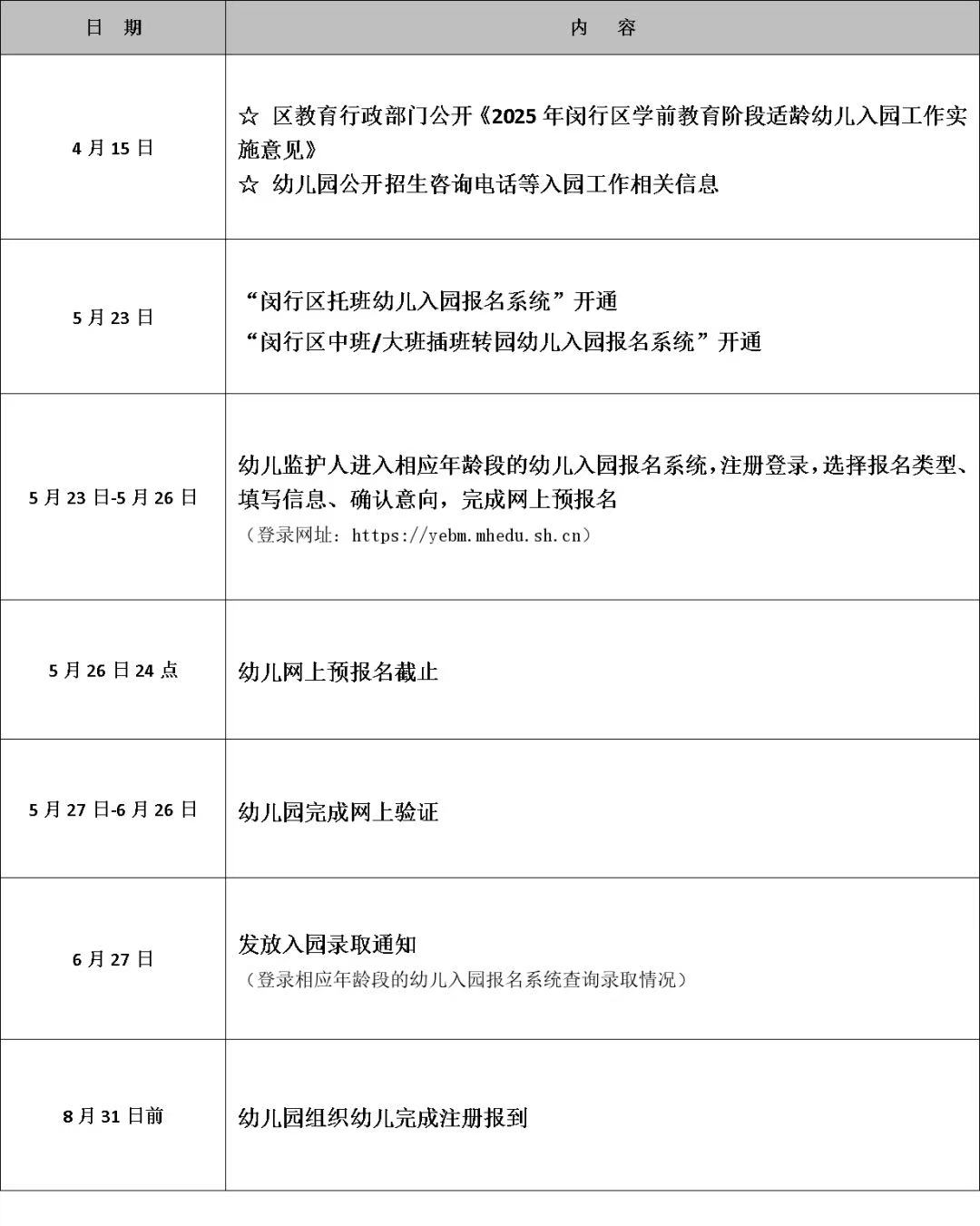 2021年5月22日-5月26日,中班/大班适龄幼儿监护人进入区报名系统(网址:https://yebm.mhedu.sh.cn),先查询幼儿园是否有插班转园学额,再注册登录进行网上预报名。有插班转园学额的幼儿园方可接受网上预报名。