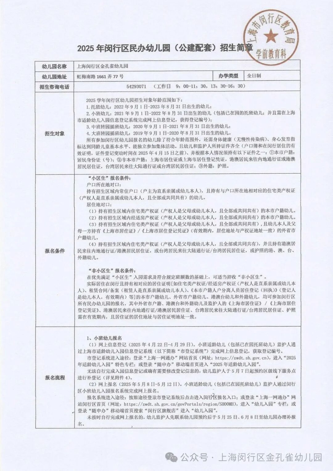 一 我们的宗旨 我们所有的努力只是为了您和孩子的一生和优秀 让您的孩子拥有快乐的童年 让您的孩子成为最好的自己 为您的孩子的成功奠基 二 我们的环境 开放:您的孩子拥有生活,游戏,运动,学习的宽敞空间。 自主:您的孩子可以自主选择活动内容,活动方式活动伙伴。 艺术:您的孩子能够在浓郁的艺术氛围中学会发现美、感受美,欣赏美,表现美,创造美。 三 我们的课程 我们使用上海市二期课改课程 ·生活活动 ·游戏活动 ·学习活动 ·运动 为您的孩子铺就童年底色 精心打造金孔雀文化课程 ·音乐 ·美术 ·舞蹈 为您的孩子培养良好的艺术素养 竭诚提供丰富多彩的选择性课程 ·英语 ·逻辑思维 ·运动体能 ·跆拳道 ·围棋 ·书法 四 招生条件 招生对象:面对闵行区全区招生 托班年龄:2017年.9月.1日-2018年.8月.31日 小班年龄:2016年.9月.1日- 2017年.8月.31日 中班年龄:2015年.9月.1日- 2016年.8月.31日 大班年龄:2014年.9月.1日- 2015年.8月.31日 报名地点:金孔雀幼儿园(虹梅南路1661弄77弄) 联系人:闵园长 联系电话:021-54293071 —END— 电话:021-54293071 地址:上海市闵行区虹梅南路1661弄77 号
