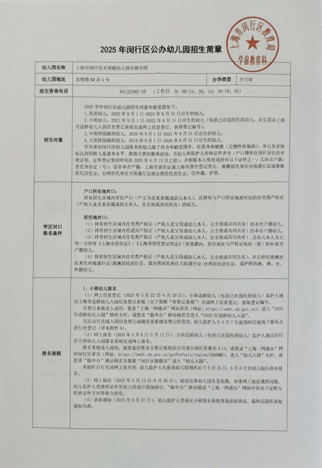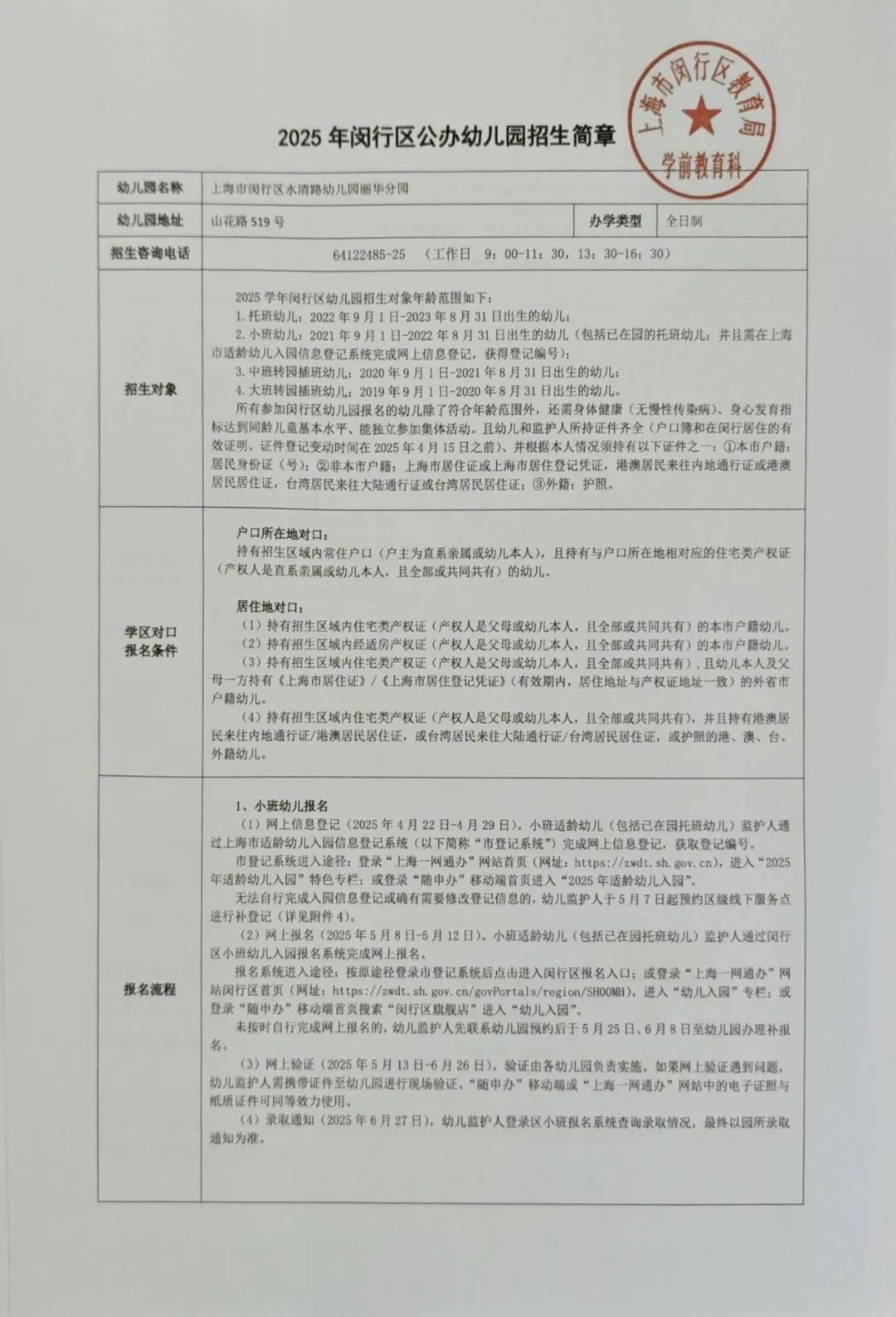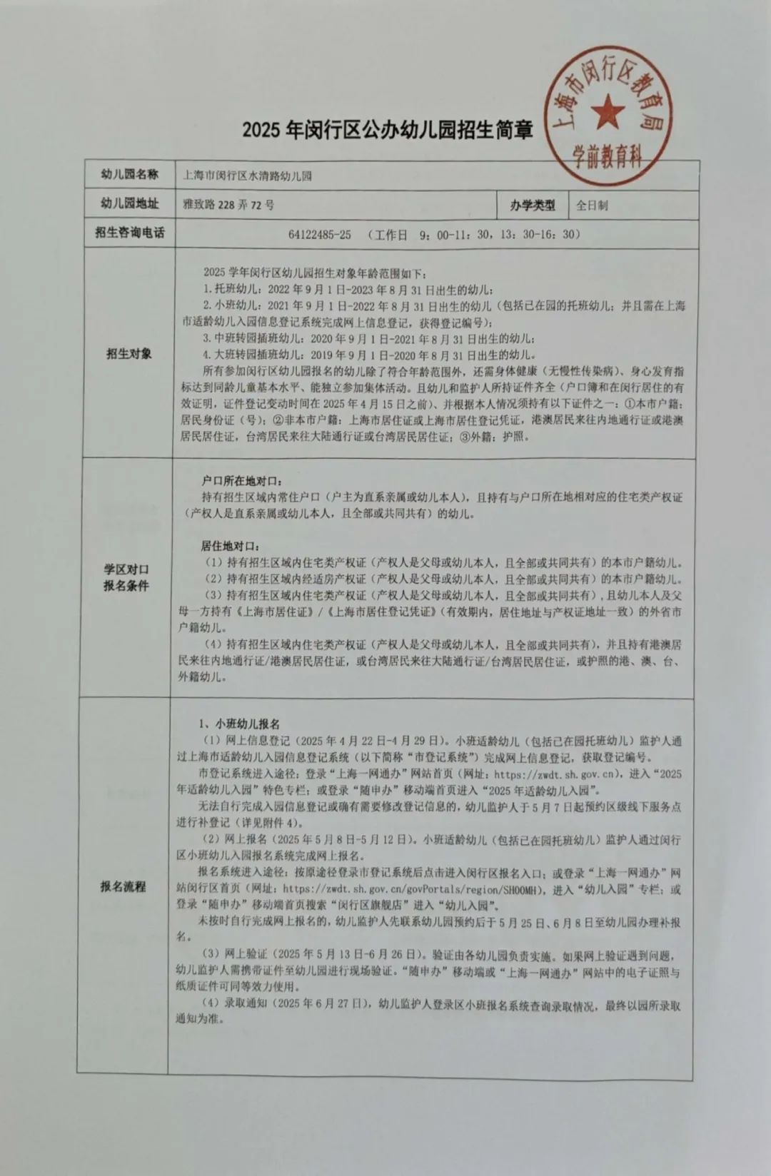 zhao sheng jian zhang 办学等级 一级 幼儿园地址 闵行区雅致路228弄72号 办学类型 全日制 招生咨询电话 64606722-801 64122485-25(工作日 09:00-11:30,13:30-16:30) 2016年9月1日-2017年8月31日出生(包括在园托班幼儿),并且已在市登记系统完成网上信息登记、获取登记编号的幼儿。 持有的相关证件/证明材料(包括幼儿户口簿、实际居住在闵行区的有效居住证明、《上海市居住证》/《上海市居住登记凭证》等)的变动(登记)时间为2020年4月15日之前、身体健康(无慢性传染病)、智力正常、能正常参加集体活动,并符合以下报名条件的适龄幼儿。 户口所在地对口: 持有招生区域内常住户口(户主为直系亲属或幼儿本人),并且持有与户口所在地相对应的住宅类产权证(产权人是直系亲属或幼儿本人,且全部或共同共有)的幼儿。 居住地对口: (1)持有招生区域内住宅类产权证(产权人是父母或幼儿本人,且全部或共同共有)的本市户籍幼儿。 (2)持有招生区域内经适房产权证(产权人是父母或幼儿本人,且全部或共同共有)的本市户籍幼儿。 (3)持有招生区域内住宅类产权证(产权人是父母或幼儿本人,且全部或共同共有),并且幼儿本人及父母一方持有《上海市居住证》/《上海市居住登记凭证》(有效期内,居住地址与产权证地址一致)的外省市户籍幼儿。 (4)持有招生区域内住宅类产权证(产权人是父母或幼儿本人,且全部或共同共有),并且持有港澳居民来往内地通行证/港澳居民居住证、台湾居民来往大陆通行证/台湾居民居住证、护照,的港、澳、台、外籍幼儿。 本区小班适龄幼儿入园工作实行公民办幼儿园同步登记、同步报名、同步验证的方式,主要分为网上信息登记、网上报名、现场验证和录取通知四个阶段。 1、网上信息登记。2020年4月24日-4月30日,小班适龄幼儿(包括在园托班幼儿)监护人登录市登记系统(网址:https://shrydj.edu.sh.cn,也可通过“一网通办”进入)进行网上信息登记、获取登记编号。 2、网上报名。2020年5月11日-5月17日,小班适龄幼儿(包括在园托班幼儿)监护人登录区报名系统(网址:https://yebm.mhedu.sh.cn)进行网上报名。报名截止后,网上报名成功的幼儿监护人可下载打印《2020年闵行区幼儿园小班幼儿报名表》。 3、现场验证。2020年5月27日-5月31日,网上报名成功的适龄幼儿监护人登录区报名系统查询现场验证相关信息,并打印《闵行区幼儿园现场验证通知单》。2020年5月30日-5月31日,适龄幼儿监护人持相关证件、携幼儿本人到指定幼儿园进行第一批现场验证。2020年6月13日,未选择报名符合对口报名条件的的公办幼儿园或民办幼儿园“小区生”,又未通过民办幼儿园“非小区生”或全区招生民办幼儿园面谈的幼儿,参加公办幼儿园或民办幼儿园“小区生”第二批现场验证。 4、录取通知。2020年6月24日-6月28日,遵循人户一致优先的原则,依据区报名系统中幼儿入园条件排序情况、幼儿实际报名情况及街镇、幼儿园资源配置情况,完成幼儿录取工作。幼儿监护人登录区报名系统查询录取情况。 按户口所在地对口报名的幼儿现场验证时需持有的证件有:《闵行区幼儿园现场验证通知单》、《2020年闵行区幼儿园小班幼儿报名表》、出生证、幼儿户口簿、与户口所在地相对应的住宅类产权证(产权人是直系亲属或幼儿本人,且全部或共同共有)、预防接种证等证件的原件及复印件。 按居住地对口报名的幼儿现场验证时需持有的证件有:《闵行区幼儿园现场验证通知单》、《2020年闵行区幼儿园小班幼儿幼儿报名表》、出生证、幼儿户口簿(或港、澳、台、外籍幼儿相对应的身份证明)、招生区域内的居住证明[如住宅类产权证/经适房产权证(产权人是父母或幼儿本人,且全部或共同共有)、廉租房/公租房租赁证明(租赁人是父母或幼儿本人,租赁地址与实际居住地址一致)等]、预防接种证等证件的原件及复印件。外省市户籍幼儿还需提供幼儿本人及父母一方的《上海市居住证》/《上海市居住登记凭证》(有效期内,居住地址与产权证地址一致)原件及复印件,积分已达标的还需提供《上海市居住证积分通知单》(有效期内,居住地址与产权证地址一致,同住子女为幼儿本人)原件及复印件;如果父母一方已取得本市户籍,需提供其户口簿原件及复印件。外籍幼儿现场验证时还需提供的证件参照《2020年闵行区适龄幼儿入园工作政策问答》第十条第5项的具体要求。 2020年5月30日 08:30—11:30,13:00—16:00 2020年5月31日 08:30—11:30,13:00—16:00 (验证结果与验证先后顺序无关。根据疫情防控的要求,请幼儿本人及监护人按照《闵行区幼儿园现场验证通知单》规定时间错时前往,并自觉戴好口罩、一米间隔排队,避免拥挤和长时间等待。) 闵行区雅致路228弄72号 公交:759、763、704、莘庄三路、闵行1路;地铁:1号线、5号线。 注:中班/大班插班幼儿及其他特殊情况的幼儿入园办法参照《2020年闵行区学前教育阶段适龄幼儿入园工作实施意见》及《2020年闵行区适龄幼儿入园工作政策问答》的相关要求。 闵行区水清路幼儿园 2020年4月15日