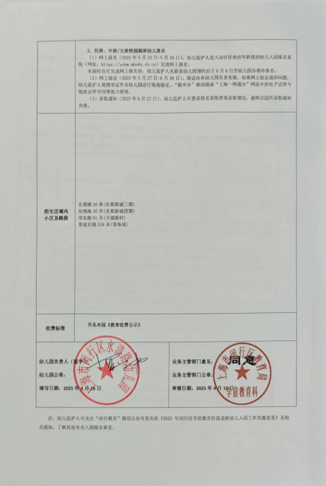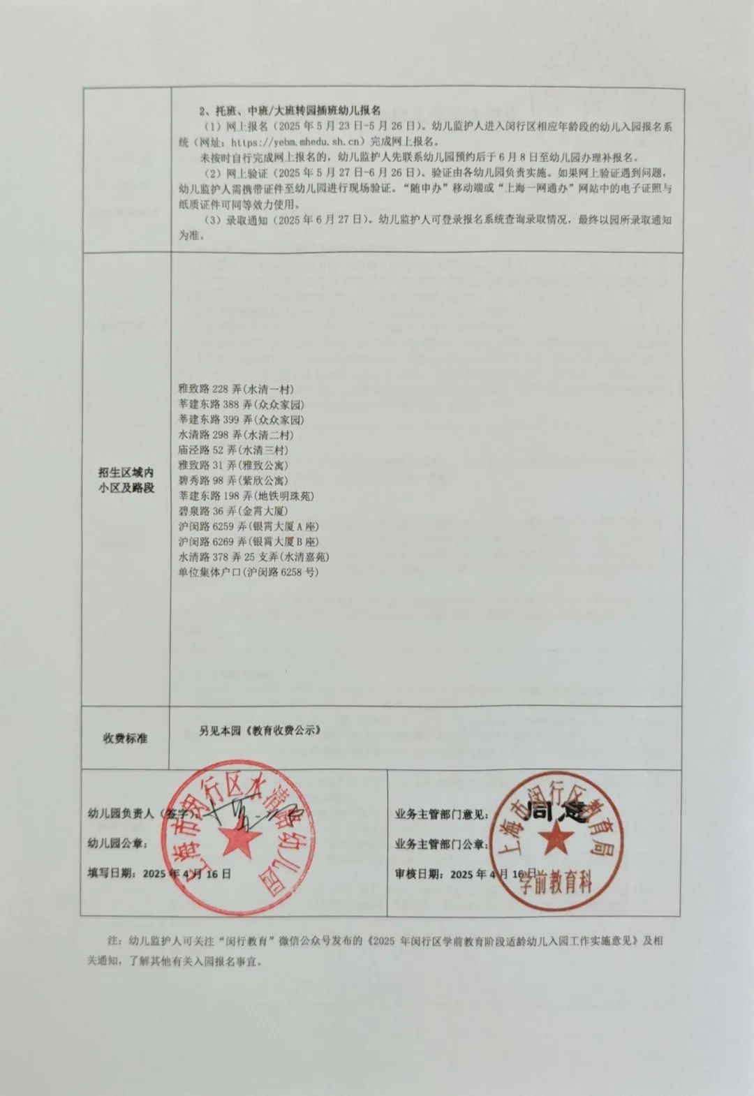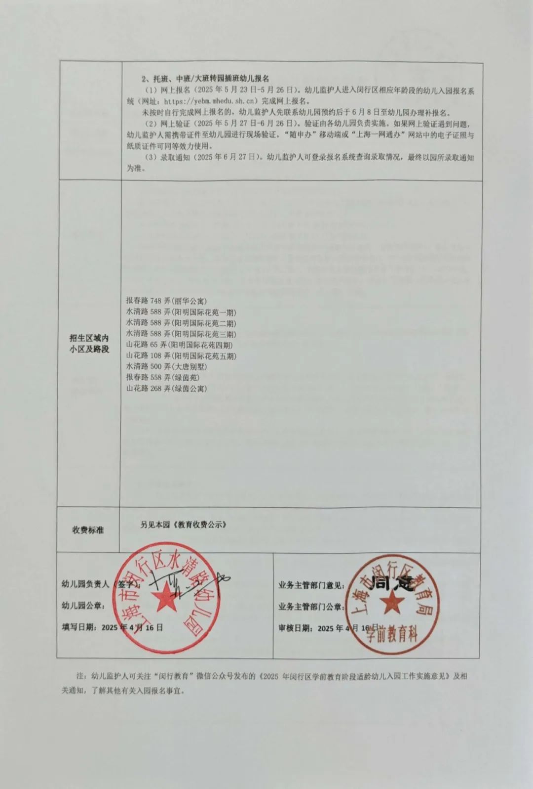 zhao sheng jian zhang 办学等级 一级 幼儿园地址 闵行区雅致路228弄72号 办学类型 全日制 招生咨询电话 64606722-801 64122485-25(工作日 09:00-11:30,13:30-16:30) 2016年9月1日-2017年8月31日出生(包括在园托班幼儿),并且已在市登记系统完成网上信息登记、获取登记编号的幼儿。 持有的相关证件/证明材料(包括幼儿户口簿、实际居住在闵行区的有效居住证明、《上海市居住证》/《上海市居住登记凭证》等)的变动(登记)时间为2020年4月15日之前、身体健康(无慢性传染病)、智力正常、能正常参加集体活动,并符合以下报名条件的适龄幼儿。 户口所在地对口: 持有招生区域内常住户口(户主为直系亲属或幼儿本人),并且持有与户口所在地相对应的住宅类产权证(产权人是直系亲属或幼儿本人,且全部或共同共有)的幼儿。 居住地对口: (1)持有招生区域内住宅类产权证(产权人是父母或幼儿本人,且全部或共同共有)的本市户籍幼儿。 (2)持有招生区域内经适房产权证(产权人是父母或幼儿本人,且全部或共同共有)的本市户籍幼儿。 (3)持有招生区域内住宅类产权证(产权人是父母或幼儿本人,且全部或共同共有),并且幼儿本人及父母一方持有《上海市居住证》/《上海市居住登记凭证》(有效期内,居住地址与产权证地址一致)的外省市户籍幼儿。 (4)持有招生区域内住宅类产权证(产权人是父母或幼儿本人,且全部或共同共有),并且持有港澳居民来往内地通行证/港澳居民居住证、台湾居民来往大陆通行证/台湾居民居住证、护照,的港、澳、台、外籍幼儿。 本区小班适龄幼儿入园工作实行公民办幼儿园同步登记、同步报名、同步验证的方式,主要分为网上信息登记、网上报名、现场验证和录取通知四个阶段。 1、网上信息登记。2020年4月24日-4月30日,小班适龄幼儿(包括在园托班幼儿)监护人登录市登记系统(网址:https://shrydj.edu.sh.cn,也可通过“一网通办”进入)进行网上信息登记、获取登记编号。 2、网上报名。2020年5月11日-5月17日,小班适龄幼儿(包括在园托班幼儿)监护人登录区报名系统(网址:https://yebm.mhedu.sh.cn)进行网上报名。报名截止后,网上报名成功的幼儿监护人可下载打印《2020年闵行区幼儿园小班幼儿报名表》。 3、现场验证。2020年5月27日-5月31日,网上报名成功的适龄幼儿监护人登录区报名系统查询现场验证相关信息,并打印《闵行区幼儿园现场验证通知单》。2020年5月30日-5月31日,适龄幼儿监护人持相关证件、携幼儿本人到指定幼儿园进行第一批现场验证。2020年6月13日,未选择报名符合对口报名条件的的公办幼儿园或民办幼儿园“小区生”,又未通过民办幼儿园“非小区生”或全区招生民办幼儿园面谈的幼儿,参加公办幼儿园或民办幼儿园“小区生”第二批现场验证。 4、录取通知。2020年6月24日-6月28日,遵循人户一致优先的原则,依据区报名系统中幼儿入园条件排序情况、幼儿实际报名情况及街镇、幼儿园资源配置情况,完成幼儿录取工作。幼儿监护人登录区报名系统查询录取情况。 按户口所在地对口报名的幼儿现场验证时需持有的证件有:《闵行区幼儿园现场验证通知单》、《2020年闵行区幼儿园小班幼儿报名表》、出生证、幼儿户口簿、与户口所在地相对应的住宅类产权证(产权人是直系亲属或幼儿本人,且全部或共同共有)、预防接种证等证件的原件及复印件。 按居住地对口报名的幼儿现场验证时需持有的证件有:《闵行区幼儿园现场验证通知单》、《2020年闵行区幼儿园小班幼儿幼儿报名表》、出生证、幼儿户口簿(或港、澳、台、外籍幼儿相对应的身份证明)、招生区域内的居住证明[如住宅类产权证/经适房产权证(产权人是父母或幼儿本人,且全部或共同共有)、廉租房/公租房租赁证明(租赁人是父母或幼儿本人,租赁地址与实际居住地址一致)等]、预防接种证等证件的原件及复印件。外省市户籍幼儿还需提供幼儿本人及父母一方的《上海市居住证》/《上海市居住登记凭证》(有效期内,居住地址与产权证地址一致)原件及复印件,积分已达标的还需提供《上海市居住证积分通知单》(有效期内,居住地址与产权证地址一致,同住子女为幼儿本人)原件及复印件;如果父母一方已取得本市户籍,需提供其户口簿原件及复印件。外籍幼儿现场验证时还需提供的证件参照《2020年闵行区适龄幼儿入园工作政策问答》第十条第5项的具体要求。 2020年5月30日 08:30—11:30,13:00—16:00 2020年5月31日 08:30—11:30,13:00—16:00 (验证结果与验证先后顺序无关。根据疫情防控的要求,请幼儿本人及监护人按照《闵行区幼儿园现场验证通知单》规定时间错时前往,并自觉戴好口罩、一米间隔排队,避免拥挤和长时间等待。) 闵行区雅致路228弄72号 公交:759、763、704、莘庄三路、闵行1路;地铁:1号线、5号线。 注:中班/大班插班幼儿及其他特殊情况的幼儿入园办法参照《2020年闵行区学前教育阶段适龄幼儿入园工作实施意见》及《2020年闵行区适龄幼儿入园工作政策问答》的相关要求。 闵行区水清路幼儿园 2020年4月15日