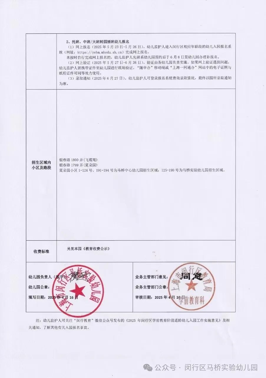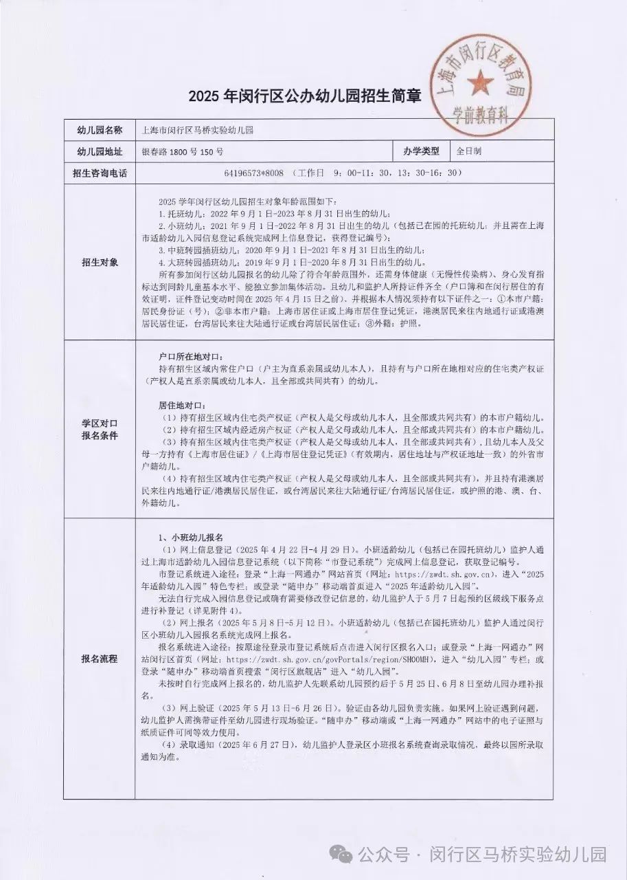 2020年招生简章 办学等级 一级 办学性质 公办 办学类型 全日制 办园地址 银春路1800弄150号 咨询电话 64191637 小班招生对象 2016年9月1日-2017年8月31日出生(包括在园托班幼儿),并且已在市登记系统完成网上信息登记、获取登记编号的幼儿。 对口报名条件 持有的相关证件/证明材料(包括幼儿户口簿、实际居住在闵行区的有效居住证明、《上海市居住证》/《上海市居住登记凭证》等)的变动(登记)时间为2020年4月15日之前、身体健康(无慢性传染病)、智力正常、能正常参加集体活动,并符合以下报名条件的适龄幼儿。 户口所在地对口: 持有招生区域内常住户口(户主为直系亲属或幼儿本人),并且持有与户口所在地相对应的住宅类产权证(产权人是直系亲属或幼儿本人,且全部或共同共有)的幼儿。 居住地对口: (1)持有招生区域内住宅类产权证(产权人是父母或幼儿本人,且全部或共同共有)的本市户籍幼儿。 (2)持有招生区域内经适房产权证(产权人是父母或幼儿本人,且全部或共同共有)的本市户籍幼儿。 (3)持有招生区域内住宅类产权证(产权人是父母或幼儿本人,且全部或共同共有),并且幼儿本人及父母一方持有《上海市居住证》/《上海市居住登记凭证》(有效期内,居住地址与产权证地址一致)的外省市户籍幼儿。 (4)持有招生区域内住宅类产权证(产权人是父母或幼儿本人,且全部或共同共有),并且持有港澳居民来往内地通行证/港澳居民居住证、台湾居民来往大陆通行证/台湾居民居住证、护照,的港、澳、台、外籍幼儿。 招生区域内小区及路段 飞碟苑银春路1800弄1号—144号 夏朵园银春路1799弄125号-190号 小班幼儿报名流程 本区小班适龄幼儿入园工作实行公民办幼儿园同步登记、同步报名、同步验证的方式,主要分为网上信息登记、网上报名、现场验证和录取通知四个阶段。 1、网上信息登记。2020年4月24日-4月30日,小班适龄幼儿(包括在园托班幼儿)监护人登录市登记系统(网址:https://shrydj.edu.sh.cn,也可通过“一网通办”进入)进行网上信息登记、获取登记编号。 2、网上报名。2020年5月11日-5月17日,小班适龄幼儿(包括在园托班幼儿)监护人登录区报名系统(网址:https://yebm.mhedu.sh.cn)进行网上报名。报名截止后,网上报名成功的幼儿监护人可下载打印《2020年闵行区幼儿园小班幼儿报名表》。 3、现场验证。2020年5月27日-5月31日,网上报名成功的适龄幼儿监护人登录区报名系统查询现场验证相关信息,并打印《闵行区幼儿园现场验证通知单》。2020年5月30日-5月31日,适龄幼儿监护人持相关证件、携幼儿本人到指定幼儿园进行第一批现场验证。2020年6月13日,未选择报名符合对口报名条件的的公办幼儿园或民办幼儿园“小区生”,又未通过民办幼儿园“非小区生”或全区招生民办幼儿园面谈的幼儿,参加公办幼儿园或民办幼儿园“小区生”第二批现场验证。 4、录取通知。2020年6月24日-6月28日,遵循人户一致优先的原则,依据区报名系统中幼儿入园条件排序情况、幼儿实际报名情况及街镇、幼儿园资源配置情况,完成幼儿录取工作。幼儿监护人登录区报名系统查询录取情况。 现场验证材料要求 按户口所在地对口报名的幼儿现场验证时需持有的证件有:《闵行区幼儿园现场验证通知单》、《2020年闵行区幼儿园小班幼儿报名表》、出生证、幼儿户口簿、与户口所在地相对应的住宅类产权证(产权人是直系亲属或幼儿本人,且全部或共同共有)、预防接种证等证件的原件及复印件。 按居住地对口报名的幼儿现场验证时需持有的证件有:《闵行区幼儿园现场验证通知单》、《2020年闵行区幼儿园小班幼儿幼儿报名表》、出生证、幼儿户口簿(或港、澳、台、外籍幼儿相对应的身份证明)、招生区域内的居住证明[如住宅类产权证/经适房产权证(产权人是父母或幼儿本人,且全部或共同共有)、廉租房/公租房租赁证明(租赁人是父母或幼儿本人,租赁地址与实际居住地址一致)等]、预防接种证等证件的原件及复印件。外省市户籍幼儿还需提供幼儿本人及父母一方的《上海市居住证》/《上海市居住登记凭证》(有效期内,居住地址与产权证地址一致)原件及复印件,积分已达标的还需提供《上海市居住证积分通知单》(有效期内,居住地址与产权证地址一致,同住子女为幼儿本人)原件及复印件;如果父母一方已取得本市户籍,需提供其户口簿原件及复印件。外籍幼儿现场验证时还需提供的证件参照《2020年闵行区适龄幼儿入园工作政策问答》第十条第5项的具体要求。 小班幼儿现场验证时间 2020年5月30日 08:30—11:30,13:00—16:00 2020年5月31日 08:30—11:30,13:00—16:00 (验证结果与验证先后顺序无关。根据疫情防控的要求,请幼儿本人及监护人按照《闵行区幼儿园现场验证通知单》规定时间错时前往,并自觉戴好口罩、一米间隔排队,避免拥挤和长时间等待。) 现场验证地址 上海市闵行区银春路1800弄150号(马桥实验幼儿园底楼大厅) 推荐公共交通 闵行21路 闵行29路 闵行40路 江川2路 马桥1路 收费标准 另见本园《教育收费公示》 注:中班/大班插班幼儿、托班幼儿及其他特殊情况的幼儿入园办法参照《2020年闵行区学前教育阶段适龄幼儿入园工作实施意见》及《2020年闵行区适龄幼儿入园工作政策问答》的相关要求。