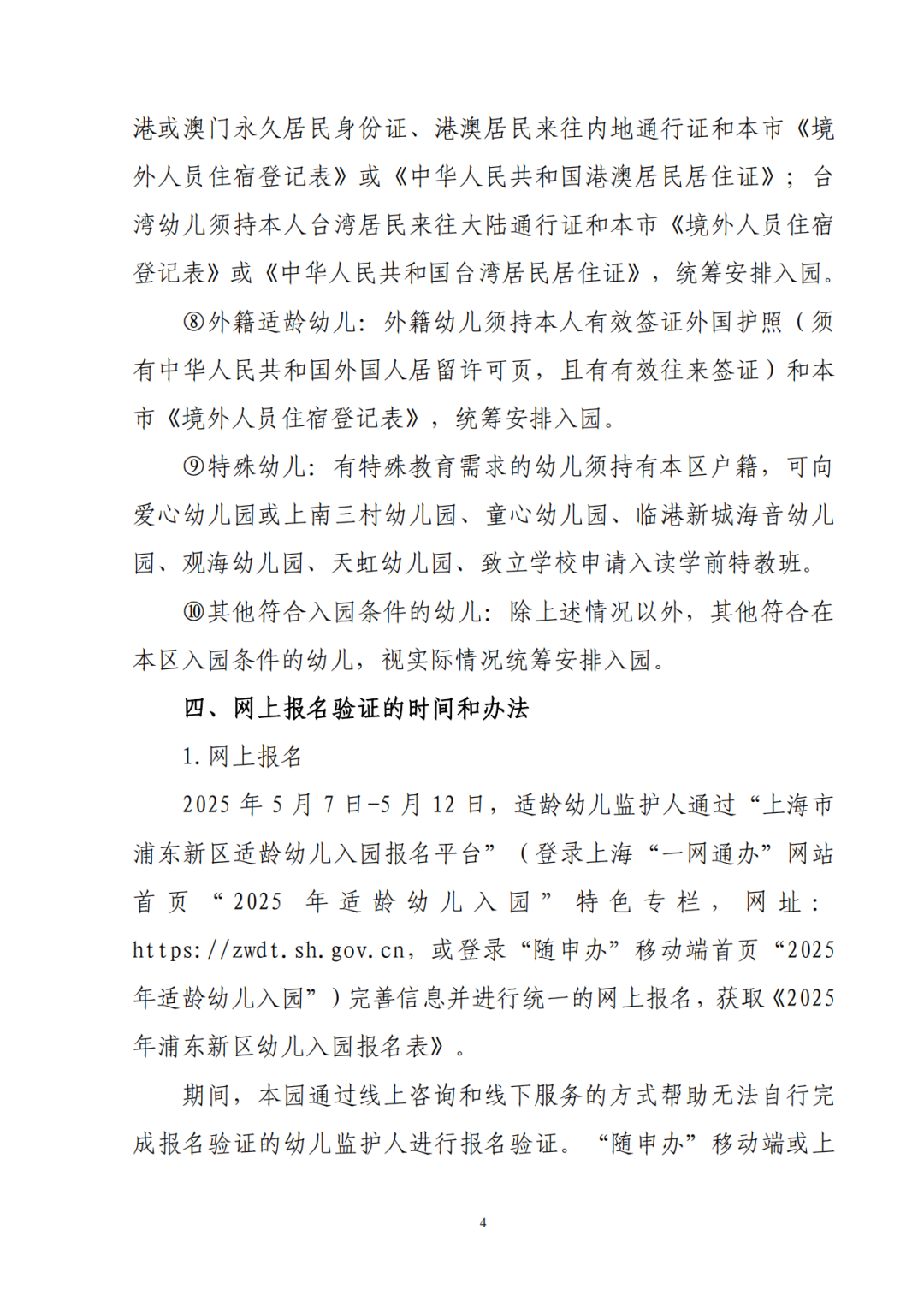 ⑨特殊幼儿:有特殊教育需求的幼儿须持有本区户籍,可向爱心幼儿园或上南三村幼儿园、童心幼儿园、临港新城海音幼儿园、致立学校申请入读学前特教班。
