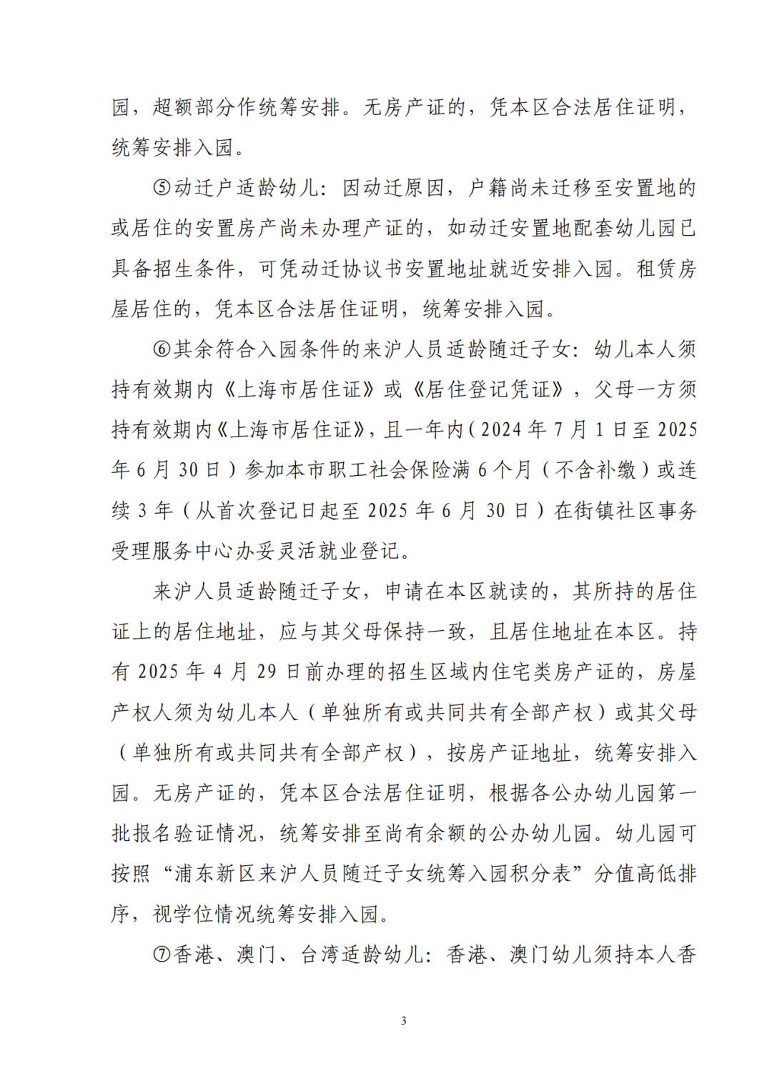 来沪人员适龄随迁子女,申请在本区就读的,其所持的居住证上的居住地址,应与其父母保持一致,且居住地址在本区。持有2023年4月27日前办理的招生区域内住宅类房产证的,房屋产权人须为幼儿本人(单独所有或共同共有全部产权)或其父母(单独所有或共同共有全部产权),按房产证地址,统筹安排入园。无房产证的,凭本区合法居住证明,根据各公民办幼儿园第一批报名验证情况,统筹安排至尚有余额的公办幼儿园或民办三级幼儿园。幼儿园可按照“浦东新区来沪人员随迁子女统筹入园积分表”分值高低排序,视学位情况统筹安排入园。