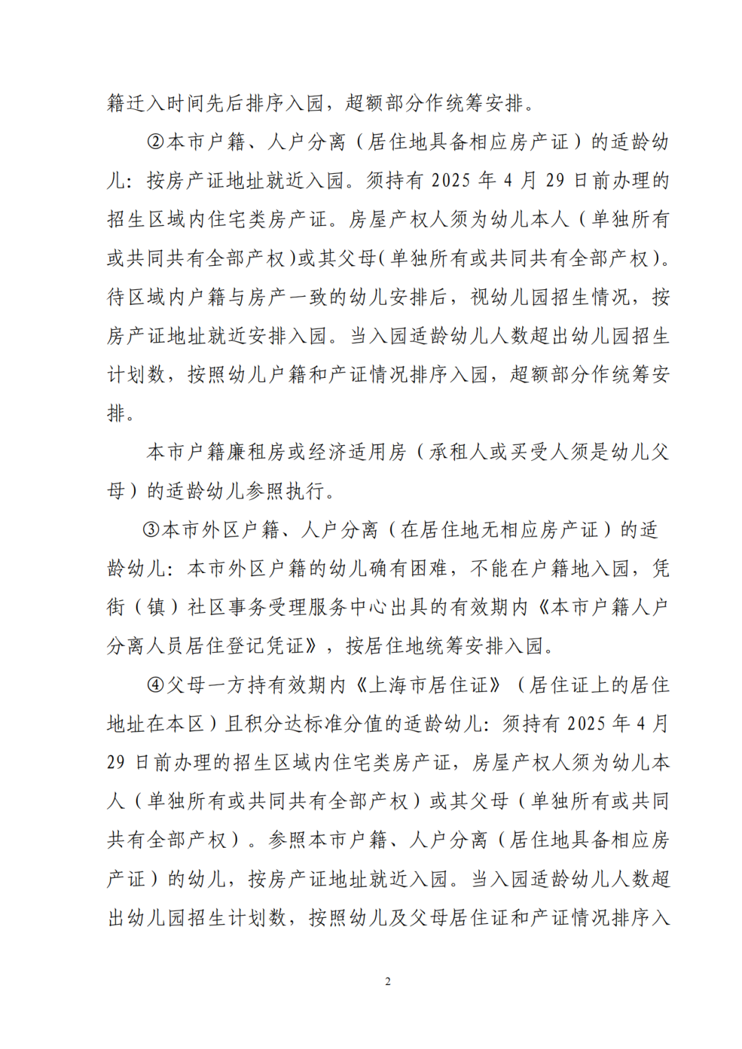 ②本市户籍、人户分离(居住地具备相应房产证)的适龄幼儿:按房产证地址就近入园。须持有2023年4月27日前办理的招生区域内住宅类房产证。房屋产权人须为幼儿本人(单独所有或共同共有全部产权)或其父母(单独所有或共同共有全部产权)。待区域内户籍与房产一致的幼儿安排后,视幼儿园招生情况,按房产证地址就近安排入园。当入园适龄幼儿人数超出幼儿园招生计划数,按照幼儿户籍和产证情况排序入园,超额部分作统筹安排。