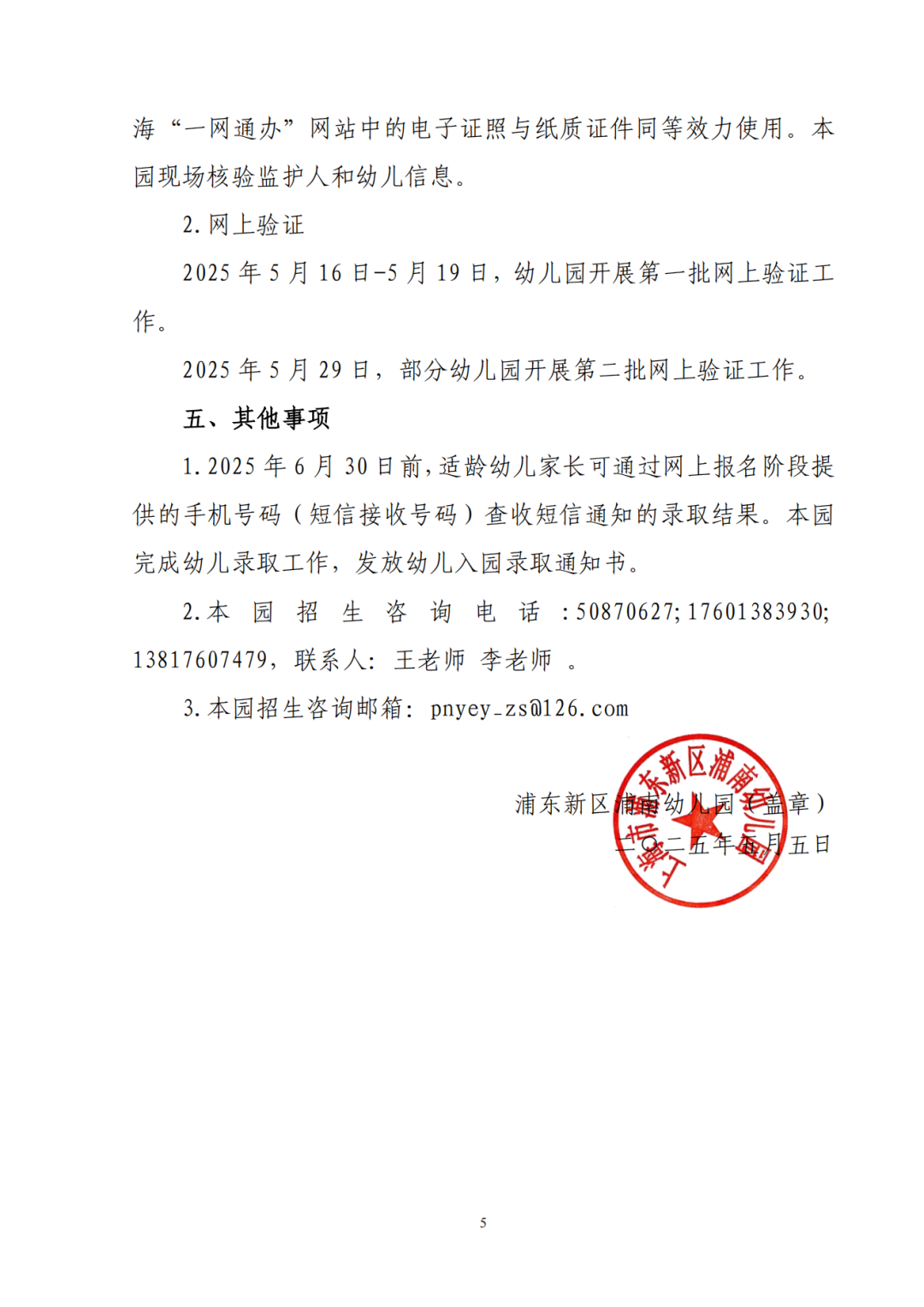 1、6月30日前,幼儿园将完成新生录取通知工作,发放录取通知书。2、2021年,本园(潍坊部、陆家嘴部、东城部、锦和部)将按照“户籍地与居住地一致优先”的原则,优先安排户籍地与实际居住地(具备相应的房产证)一致的适龄幼儿就近入园。如本园对口招生区域内符合入园条件“户籍地与居住地一致”的入园适龄幼儿报名人数超过本园招生计划数,将按照适龄幼儿户籍迁入时间先后排序安排入园,超额部分作统筹安排。 咨询时间:工作日9:00--11:00,13:00--15:00;