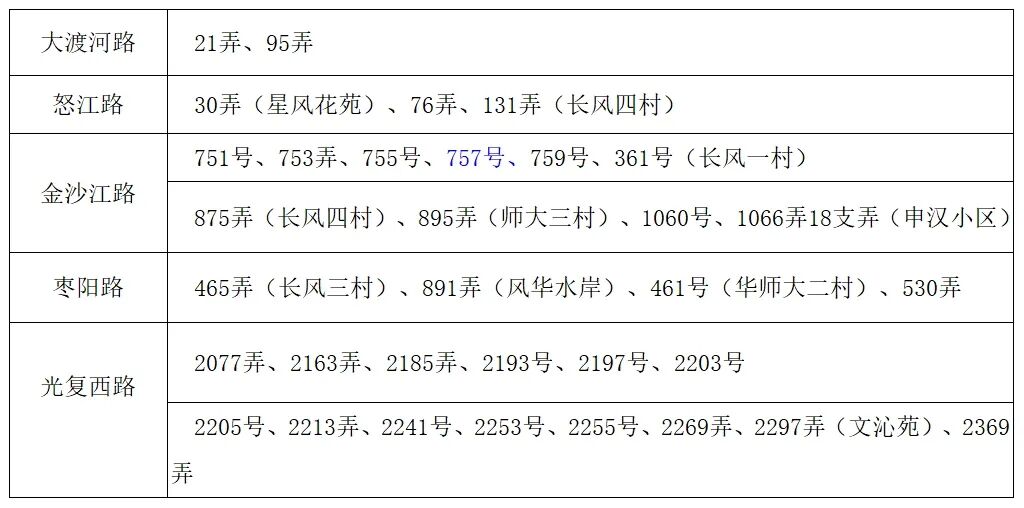 金沙江路:751号、753弄、755号、759号、长风一村、875弄(长风四村)、895弄(师大三村)、1060号、1066弄18支弄(申汉小区)