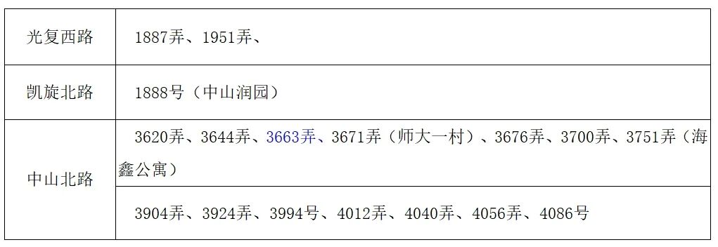 光复西路:2077弄、2163弄、2185弄、2193号、2197号、2203号、2205号、2213弄、2241号、2253号、2255号、2269弄、2297弄(文沁苑)、2369弄