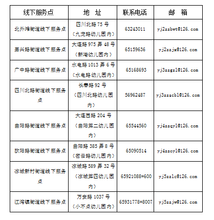 无法自行完成入园信息登记的幼儿监护人,可提前与附近的区线下服务点(见下表)进行电话咨询后,在区线下服务点完成信息登记。