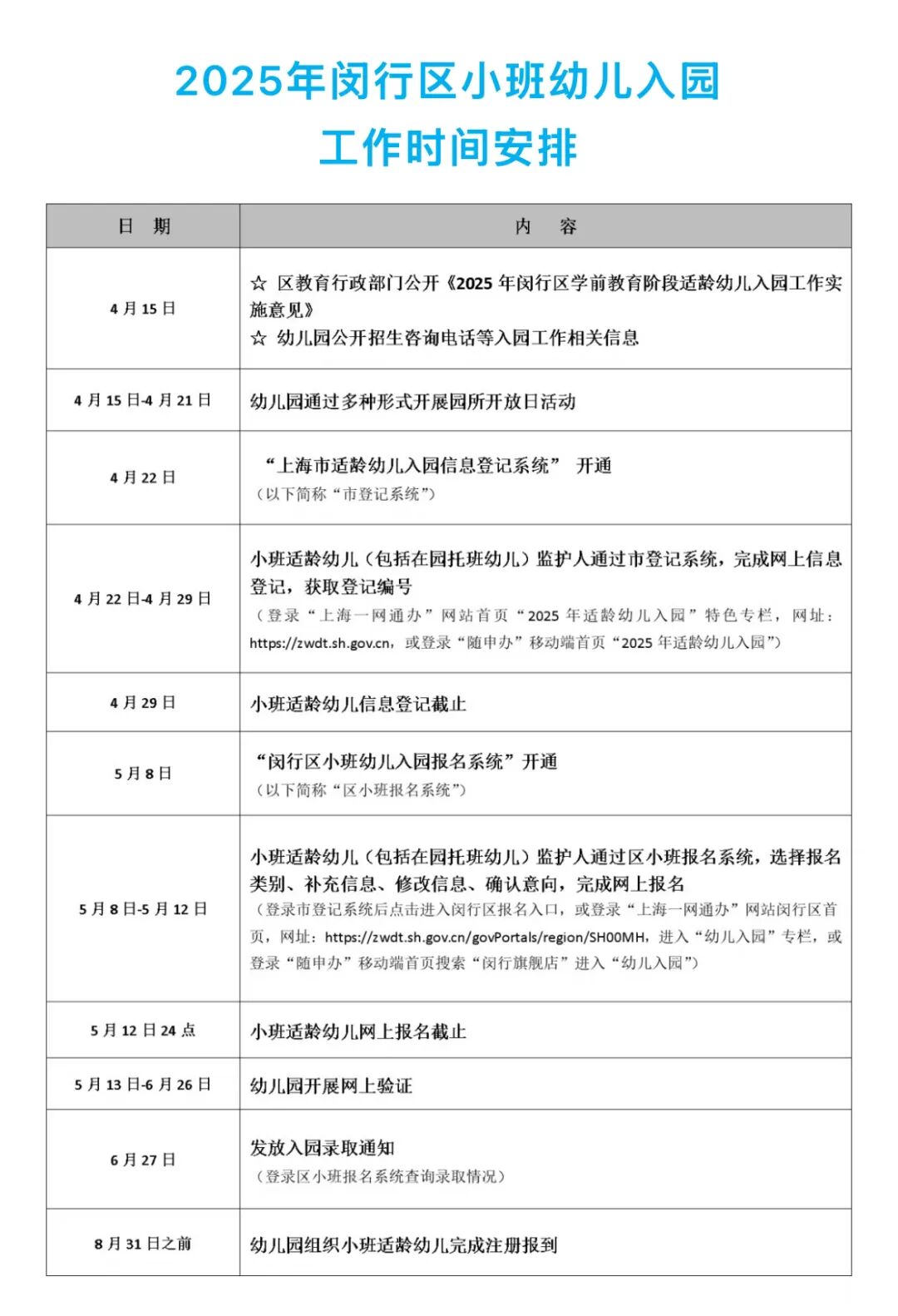 (2025年5月8日-5月12日)。小班适龄幼儿(包括已在园托班幼儿)监护人通过闵行区小班幼儿入园报名系统完成网上报名。报名系统进入途径:按原途径登录市登记系统后点击进入闵行区报名入口:或录“上海一网通办”网站闵行区首页(网址:https://zwdt.sh.gov.cn/govPortals/region/SH00MH),进入“幼儿入园”专栏:或登录“随申办”移动端首页搜索“闵行区旗舰店”进入“幼儿入园”。未按时自行完成网上报名的,幼儿监护人先联系幼儿园预约后于5月25日、6月8日至幼儿园办理补报名。
