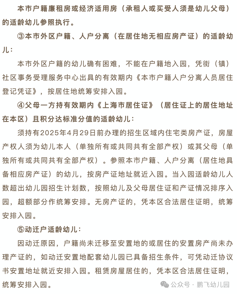 来沪人员适龄随迁子女,申请在本区就读的,其所持的居住证上的居住地址,应与其父母保持一致,且居住地址在本区。持有2025年4月29日前办理的招生区域内住宅类房产证的,房屋产权人须为幼儿本人(单独所有或共同共有全部产权)或其父母(单独所有或共同共有全部产权),按房产证地址,统筹安排入园。无房产证的,凭本区合法居住证明,根据各公办幼儿园第一批报名验证情况,统筹安排至尚有余额的公办幼儿园。幼儿园可按照“浦东新区来沪人员随迁子女统筹入园积分表”分值高低排序,视学位情况统筹安排入园。