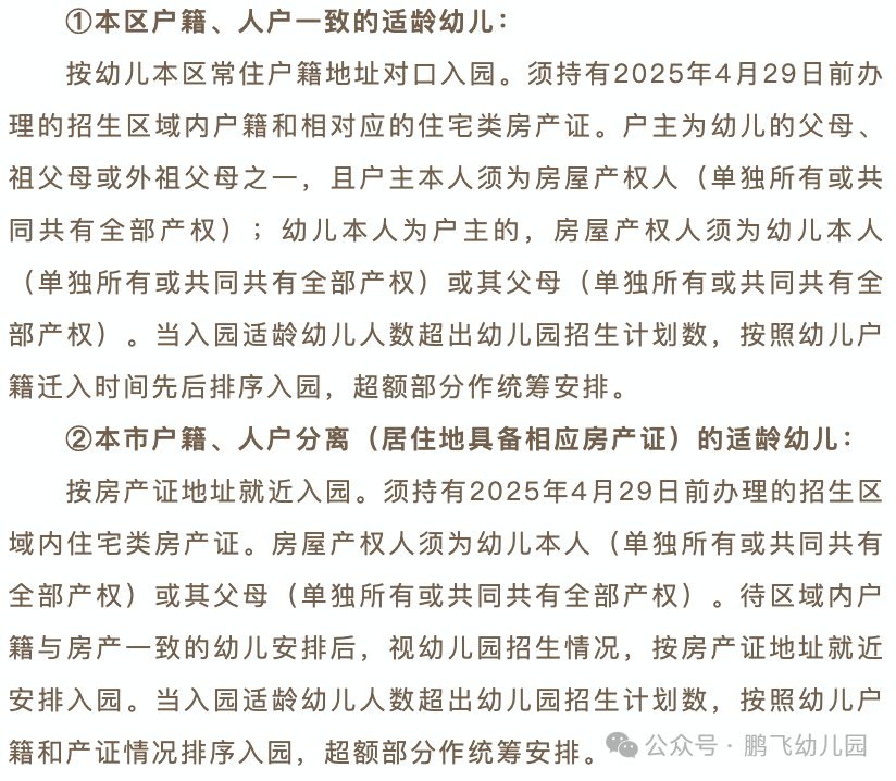 须持有2024年4月29日前办理的招生区域内住宅类房产证,房屋产权人须为幼儿本人(单独所有或共同共有全部产权)或其父母(单独所有或共同共有全部产权)。参照本市户籍、人户分离(居住地具备相应房产证)的幼儿,按房产证地址就近入园。当入园适龄幼儿人数超出幼儿园招生计划数,按照幼儿及父母居住证和产证情况排序入园,超额部分作统筹安排。无房产证的,凭本区合法居住证明,统筹安排入园。