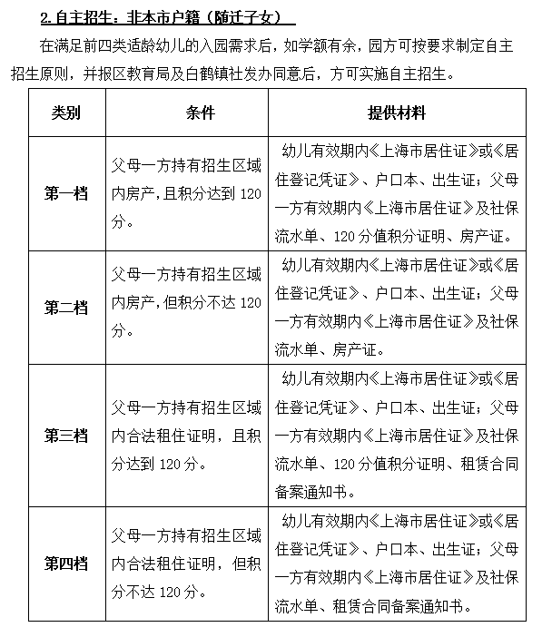 在满足前四类适龄幼儿的入园需求后,如学额有余,园方可按要求制定自主招生原则,并报区教育局及白鹤镇社发科同意后,方可实施自主招生。