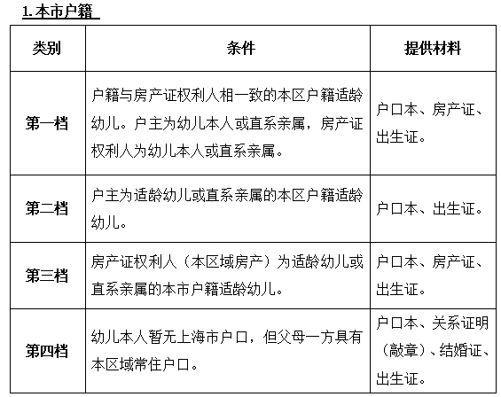 人户一致。户主及房产证权利人为幼儿本人或直系亲属。 户主为适龄幼儿或直系亲属 房产证权利人为适龄幼儿或直系亲属 幼儿本人暂无上海市户口,但父母一方具有本区常住户口 父母一方持有效期内上海市公安局统一签发的《上海市居住证》且积分达到120分标准分值,并持有招生区域内房产或具合法租住证明,幼儿持有效期内《上海市居住证》或《居住登记凭证》 父母一方持有效期内《上海市居住证》,且一年内参加本市职工社会保险满6个月(2019年7月1日至2020年6月30日,不含补缴),或连续3年(从首次登记日起至2020年6月30日)在街镇社区事务受理服务中心办妥灵活就业登记,并持有招生区域内房产或具合法租住证明,幼儿持有效期内《上海市居住证》或《居住登记凭证》 港、澳、台地区及外籍幼儿。法定监护人在本区合法任职或就业、并已在本区购房或合法租住。