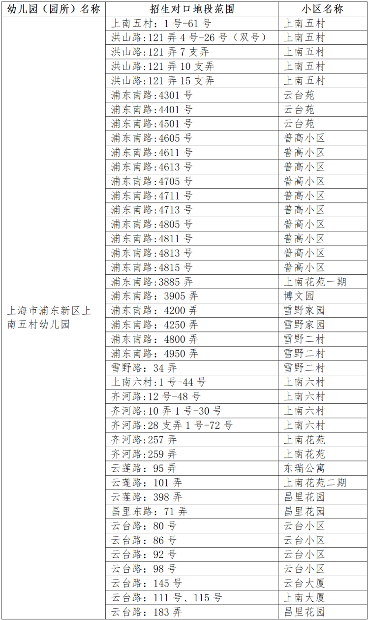 | 上海市浦东新区上南五村幼儿园 | 上南五村:1号-61号 | 上南五村 |