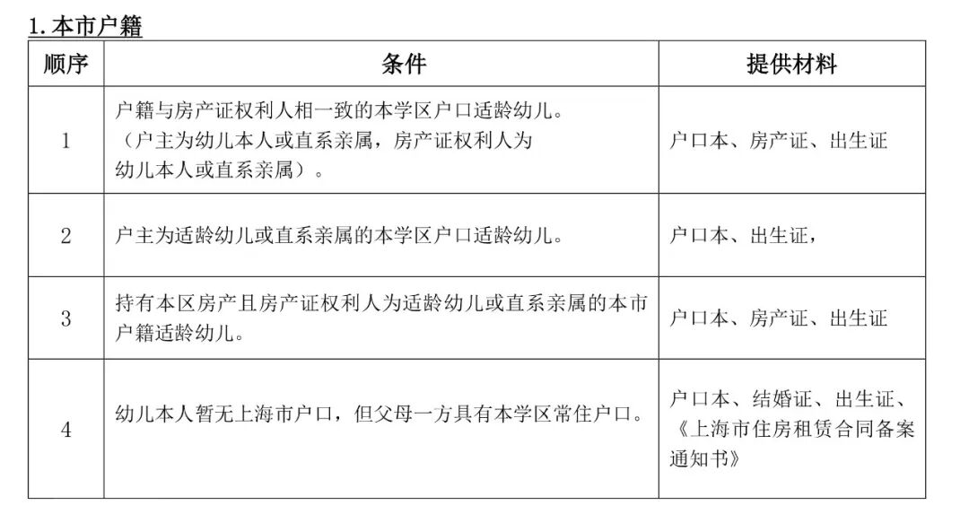人户一致。户主及房产证权利人为幼儿本人或直系亲属。 户主为适龄幼儿或直系亲属 房产证权利人为适龄幼儿或直系亲属 幼儿本人暂无上海市户口,但父母一方具有本区常住户口 父母一方持有效期内上海市公安局统一签发的《上海市居住证》且积分达到120分标准分值,并持有招生区域内房产或具合法租住证明,幼儿持有效期内《上海市居住证》或《居住登记凭证》 父母一方持有效期内《上海市居住证》,且一年内参加本市职工社会保险满6个月(2019年7月1日至2020年6月30日,不含补缴),或连续3年(从首次登记日起至2020年6月30日)在街镇社区事务受理服务中心办妥灵活就业登记,并持有招生区域内房产或具合法租住证明,幼儿持有效期内《上海市居住证》或《居住登记凭证》 港、澳、台地区及外籍幼儿。法定监护人在本区合法任职或就业、并已在本区购房或合法租住。