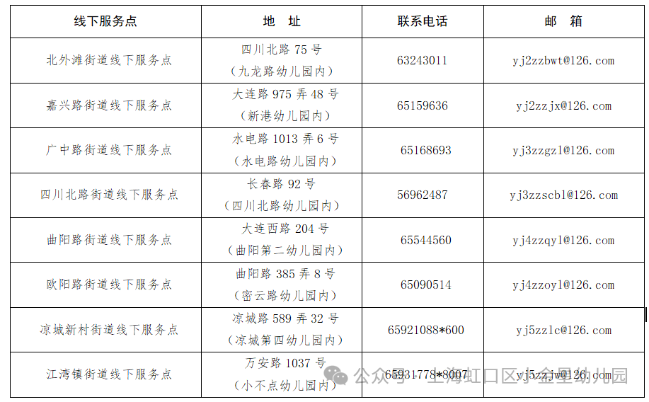 无法自行完成入园信息登记的幼儿监护人,可提前与附近的区线下服务点(见下表)进行电话咨询,在区线下服务点完成信息登记。