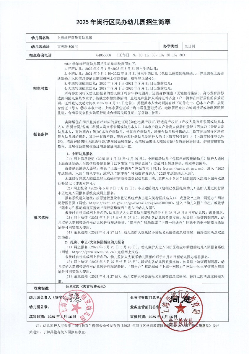 2025年闵行区幼儿园招生政策 Minhang 2025 Kindergarten Admissions Policy:
