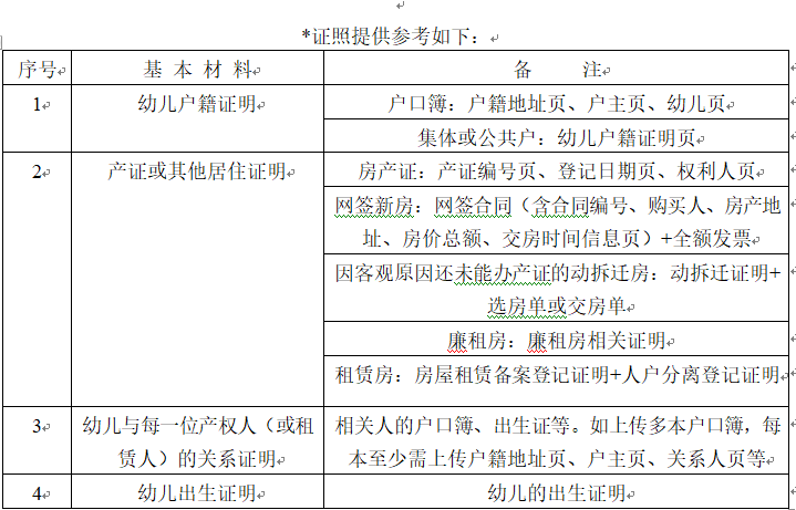 ①幼儿户籍证明 ②商品住房房地产权证或不动产权证 ③能证明幼儿与产权人关系的户籍证明 ④幼儿出生证明