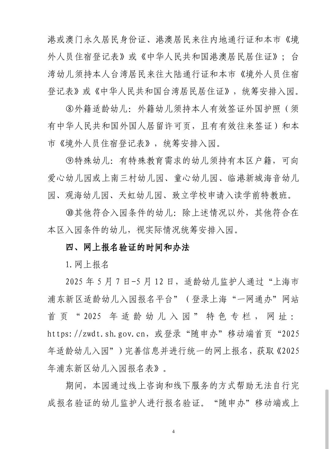 来沪人员适龄随迁子女,申请在本区就读的,其所持的居住证上的居住地址,应与其父母保持一致,且居住地址在本区。持有2020年4月30日前办理的招生区域内住宅类房产证的(房屋产权人须是幼儿父母或其本人,并全部或共同共有产权),按房产证地址,统筹安排入园。无房产证的,凭本区合法居住证明,根据各公民办幼儿园第一批报名验证情况,统筹安排至尚有余额的公办幼儿园或民办三级幼儿园。