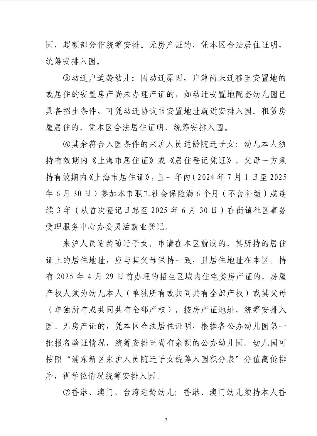 3、父母一方持有效期内《上海市居住证》(居住证上的居住地址在本区)且积分达标准分值的适龄幼儿: