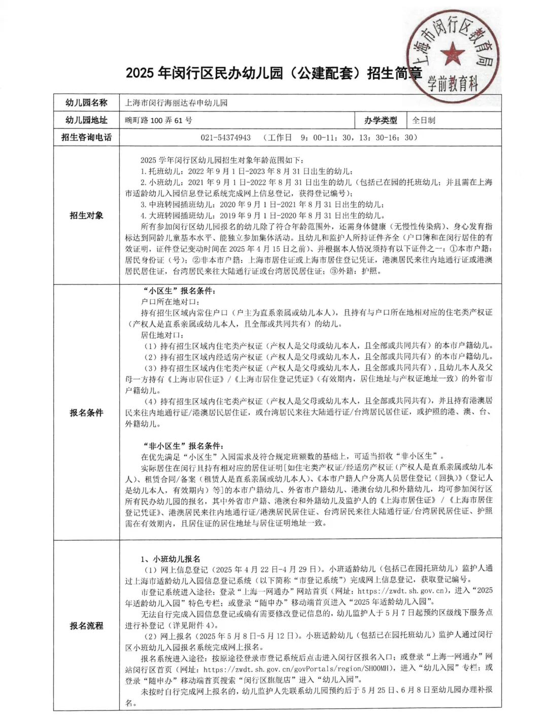 上海市闵行海丽达春申幼儿园隶属于海丽达国际幼儿教育集团,创办于2003年09月,位于闵行莘庄镇畹町路万科假日风景小区内,2016年被评为上海市一级幼儿园。全园占地面积11467㎡(生均18.3㎡),建筑面积9101.99㎡(生均12.9㎡)户外活动面积2600㎡(生均4.2㎡),生均面积均超过上海市的平均标准。 我园现有24个班级,设有托、小、中、大四个年龄段,可容纳600多个孩子。我们充分挖掘现有资源不断改善办园条件,创设了寓教育与游戏、生活与娱乐为一体的适合幼儿发展的校园环境和条件。拥有两个大型塑胶户外场地、嬉水池、沙池、种植区、空中种植区、小山坡等宽广活动场地,还有两套大型运动器械和中小型组合器械构成了幼儿运动和自主活动的快乐天地。 园内有6个幼儿专用活动室,如乐高教室、生活馆、表演室、图书室、建构室、创意美工作室等。我园重视师资队伍建设,提出“重合作、提素养、聚智慧、融资源”师资队伍发展目标,重点开展师德教育和师风建设,引导教师的责任心和进取心,形成了一支有爱心、有责任心、业务能力较强的教师队伍。为了促进幼儿全面发展,在全面实施上海市二期课改的同时,我园增设了幼儿创意美术、全日制浸入式英文、体育运动等特色项目。 近年来的主要成绩,我园被闵行区物价局评为争创《收费诚信示范民办幼儿园》先进单位、闵行区人民政府颁发的文明单位、闵行区莘庄镇教育委员会颁发的0—3岁婴幼儿早期教养基地幼儿园,幼儿和老师在区级、市级各项比赛活动中获得优异的成绩。