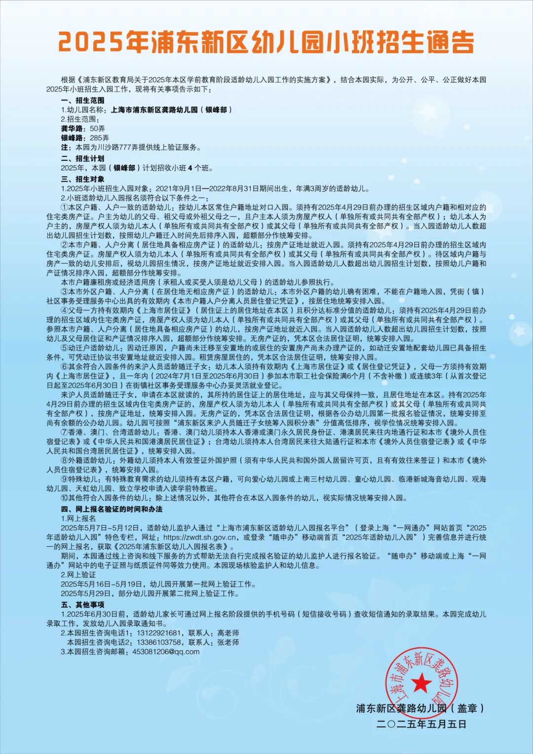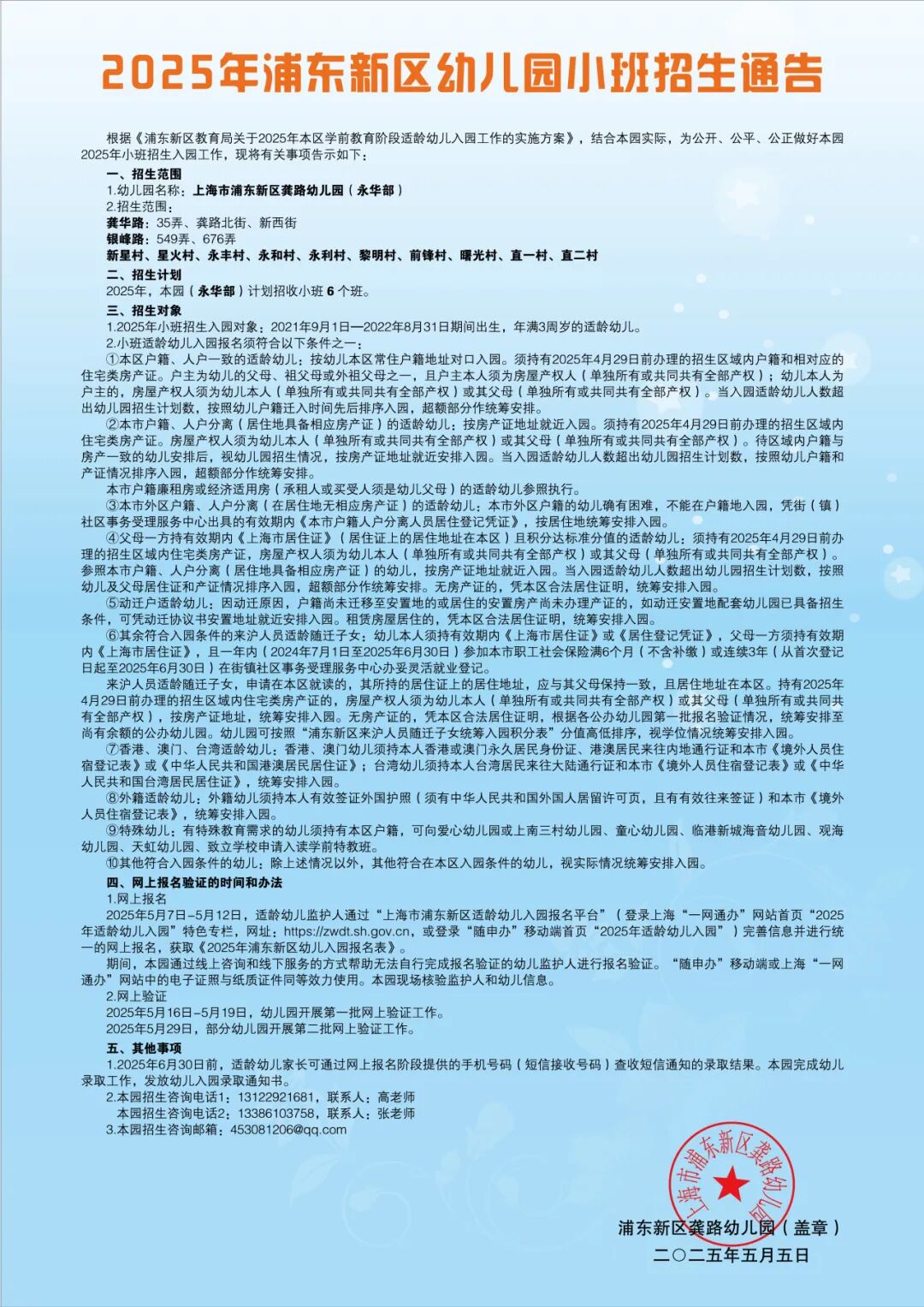 根据《浦东新区教育局关于2025年本区学前教育阶段适龄幼儿入园工作的实施方案》,结合本园实际,为公开、公平、公正做好本园2025年小班招生入园工作,现将有关事项告示如下: