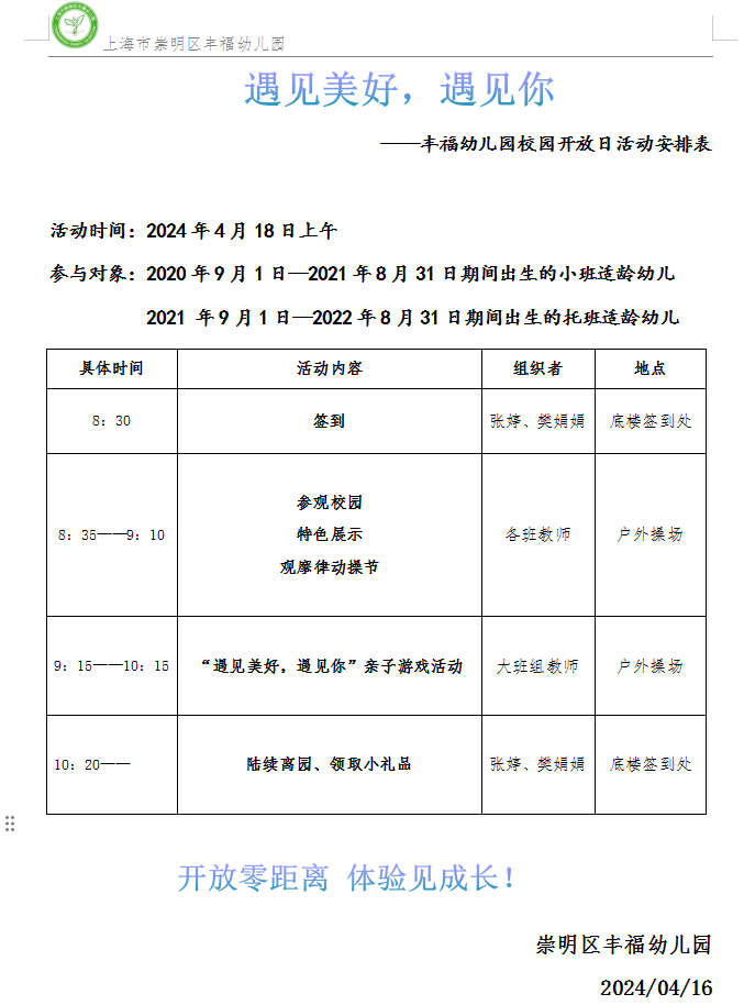 本次共招收4个小班,丰福总园3个班,前卫园区1个班,共计100名幼儿。