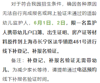 2023年长宁区新华幼儿园招生通知 根据《长宁区教育局关于做好2023年学前教育阶段适龄幼儿入园工作的通知》及有关文件精神,现将我园招生事项告知如下: 一、信息登记对象 2019年9月1日—2020年8月31日出生,身体健康(无慢性传染病)、智力正常、可正常参加集体活动的小班适龄幼儿。 二、信息登记流程 信息登记时间 4月20日—27日,全市适龄幼儿监护人通过上海市适龄幼儿入园信息登记系统(登录上海“一网通办”网站首页“2023年适龄幼儿入园”特色专栏,网址:https://zwdt.sh.gov.cn,或登录“随申办”移动端首页“2023年适龄幼儿入园”)进行统一的信息登记。登记编号作为网上报名的凭证。 网上报名 5月9日—16日,适龄幼儿监护人按照信息登记的路径进入“市登记系统”,选择各区报名—“长宁区”,进入“长宁区适龄幼儿入园报名系统”,按照本区报名条件完善相关信息、上传报名材料,完成网上报名。 三、报名验证 网上验证 我园将根据适龄幼儿监护人提供的报名材料进行网上验证,验证结果将于5月31日前通过短信或电话等方式反馈至适龄幼儿监护人。已收到网上验证通过提示的适龄幼儿监护人无需再到幼儿园进行验证。 线下补登记、补报名验证 对于符合我园招生条件,确因各种原因无法自行完成报名或网上验证未通过的适龄幼儿监护人,6月3日、4日,限一名监护人携带幼儿户口簿、出生证明、房产证等材料原件到上海市长宁区法华镇路451号进行线下补登记、补报名验证。备注:补登记、补报名验证无需带幼儿。为减少家长等待,须提前通过电话预约线下补报名验证时间。 四、招生范围 幼儿户籍在我园招生地段或幼儿为上海户籍且父母一方的房产证地址在我园招生地段内。我园招生地段如下: 1.番禺路(单):209弄(弄内双号)、211号-619号 番禺路(双):222弄(弄内双号)、228号-586号 2.法华镇路:1- 632号 3.新华路:1-483号 4.幸福路:1-200号 5.华山路(单):1389弄-1635号 华山路(双):1520弄-1682号 6.定西路(双):2-708号 7.淮海西路(双) 8.淮海中路(双):1950弄-2068号 9.兴国路(双) 10.香花桥路 11.泰安路:53号-141号 12.湖南路(单):421号-579号 13.安顺路:58弄、68弄 14.云阳路:34弄 五、录取通知 6月中旬起,分批发放录取通知。幼儿园遵循本区户籍人户一致幼儿优先录取的原则。将根据招生的实际情况,对适龄幼儿与户主关系、户口迁入年限及产权所有人有所要求,对符合要求的实行对口入园;对不符合对口入园的实行区域统筹入园。 注: 咨询(预约)电话:52308108转806 (工作日8:30-11:00、 13:30-16:00) 电子邮箱: xinhuayou666@126.com - END -