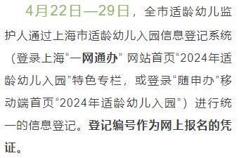 2.信息登记时间:4月24日——30日,适龄幼儿监护人需自行在“上海市适龄幼儿入园信息登记系统”(网址:https://shrydj.edu.sh.cn)或“一网通办”完成信息登记。登记编号作为幼儿网上报名的凭证。