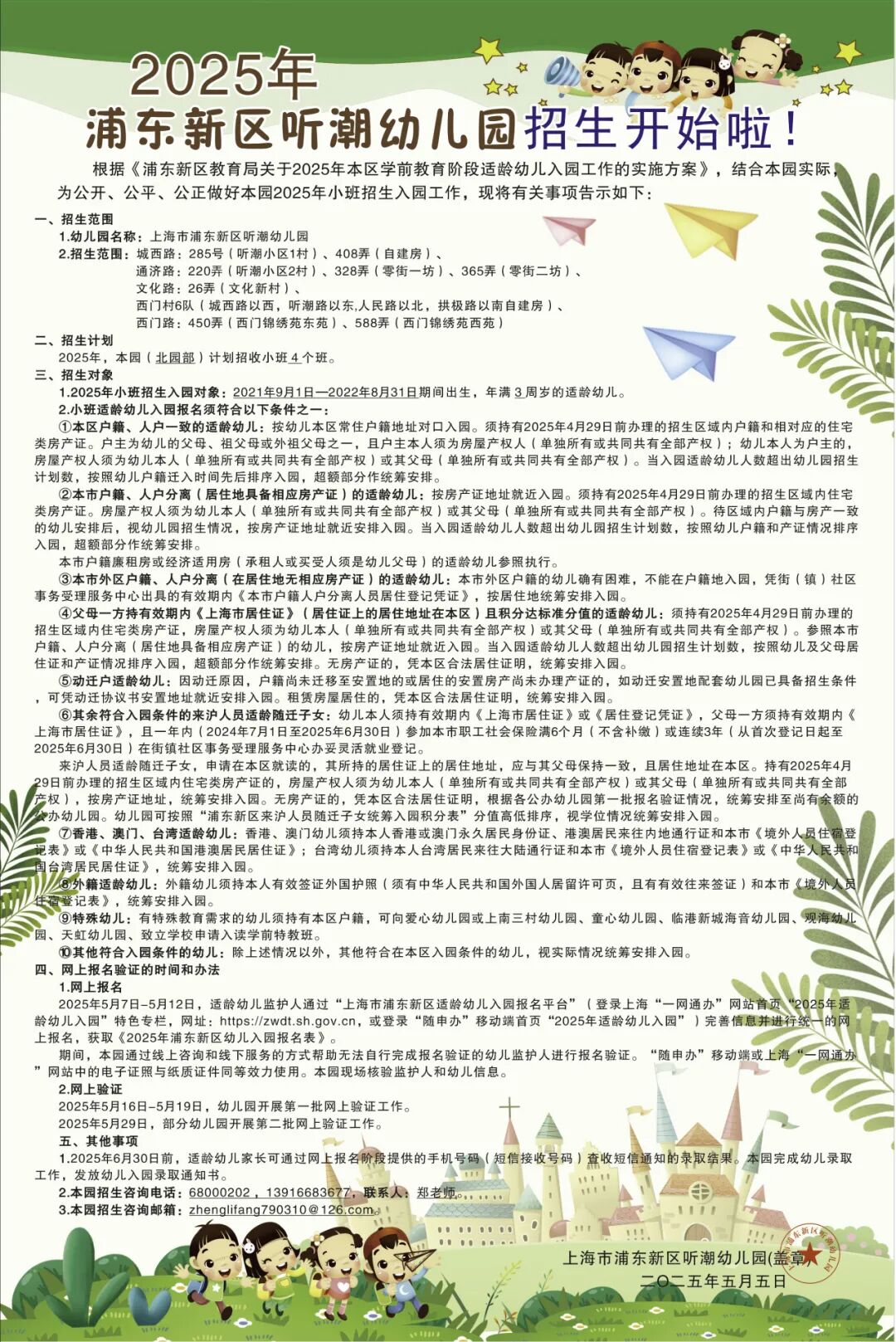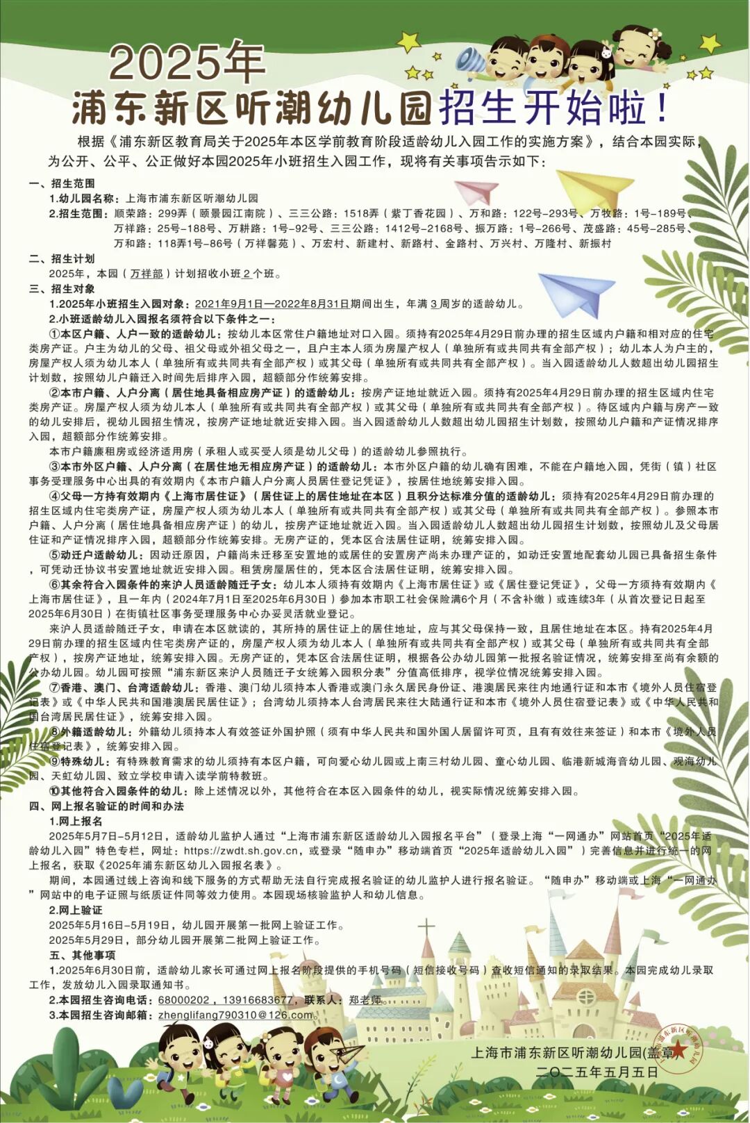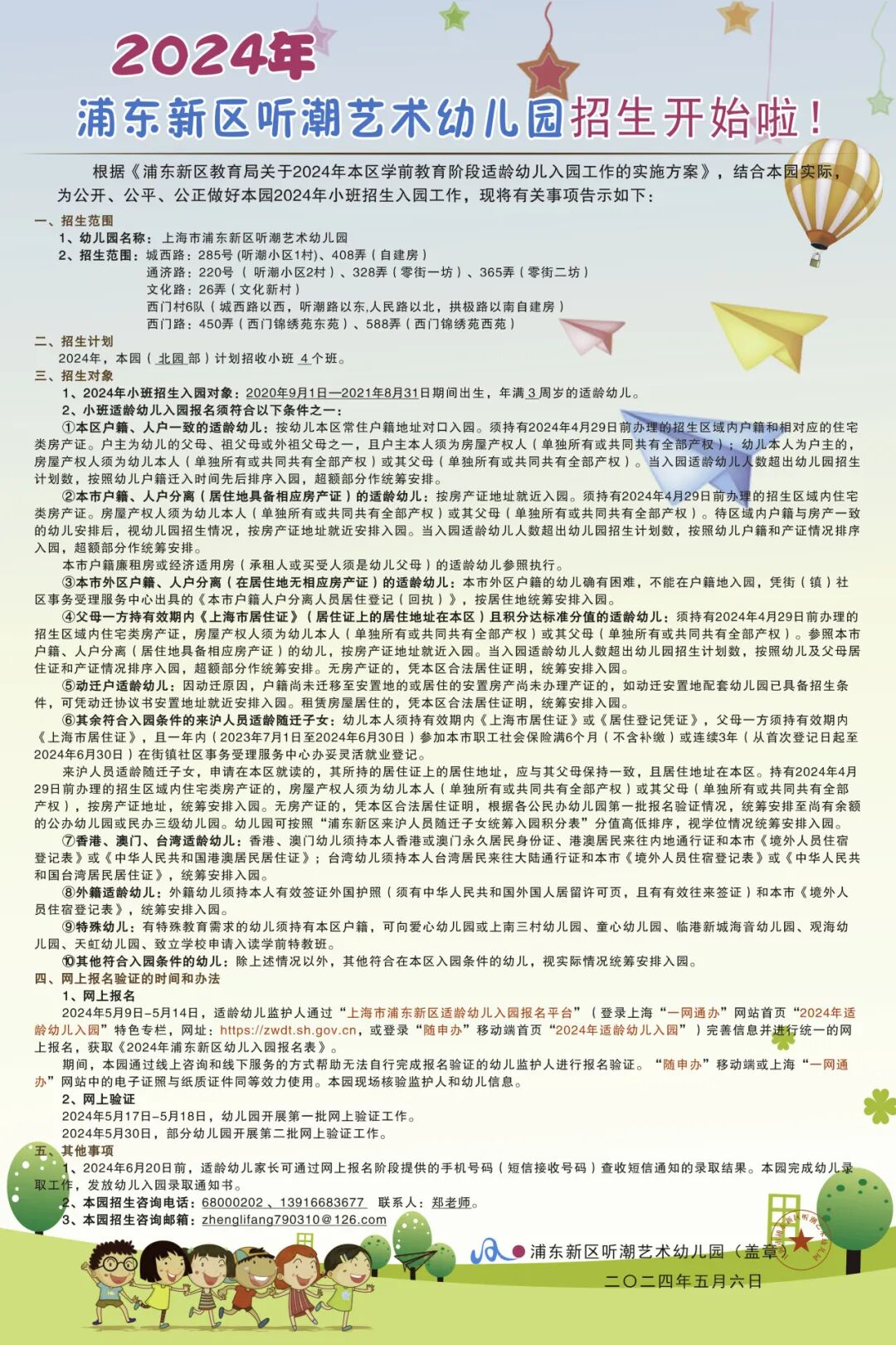 香桂部 (点击查看大图) 温馨提示 ✦ 1.相关链接 (1)网上报名:浦东新区适龄幼儿入园报名平台 上海“一网通办”网站(https://zwdt.sh.gov.cn)首页“2023年适龄幼儿入园”特色专栏,及“随申办”移动端首页“2023年适龄幼儿入园”模块将正式开通。 (2)2023年适龄幼儿入园网上登记流程 (点击链接阅读查看) (3)我园线上校园开放日 第481期【家园共育】云游“听艺” ,遇见美好 ——听潮艺术幼儿园云上校园开放日 (点击链接阅读查看) (4)浦东新区民办幼儿园及托育机构信息 ▪2023年浦东新区民办幼儿园信息公示 ▪2023年浦东新区托育机构信息公示 ✦ 2.验证安排 网上验证: 2023年5月17日-5月18日,我园开展第一批网上验证工作。 2023年5月31日,我园开展第二批网上验证工作。 线下验证: 对确因特殊原因未按时办理各类证件的幼儿或登记成功后,确有需要修改信息的家长,请先提前三天进行预约,我们会安排教师开展线下审核验证,请严格按照预约时间,携带相关证件准时来园。 (1)验证时间: 2023年5月17日-5月18日:第一批网上验证 (上午:8:00-11:00;下午:13:00-16:00) 2023年5月31日:第二批网上验证 (上午:8:00-11:00;下午:13:00-16:00) (2)有特殊需求家长,严格按照电话预约时间,携带相关证件准时来园验证。 (3)入园后请耐心在等候区等待,轮到之后进入验证室验证。 (4)请全程佩戴口罩,与他人保持安全距离。 ✦ 3.招生咨询电话 联系人: ▪ 郑老师 13916683677 ▪ 张老师 13482365951 ▪ 办公室咨询电话 68000202