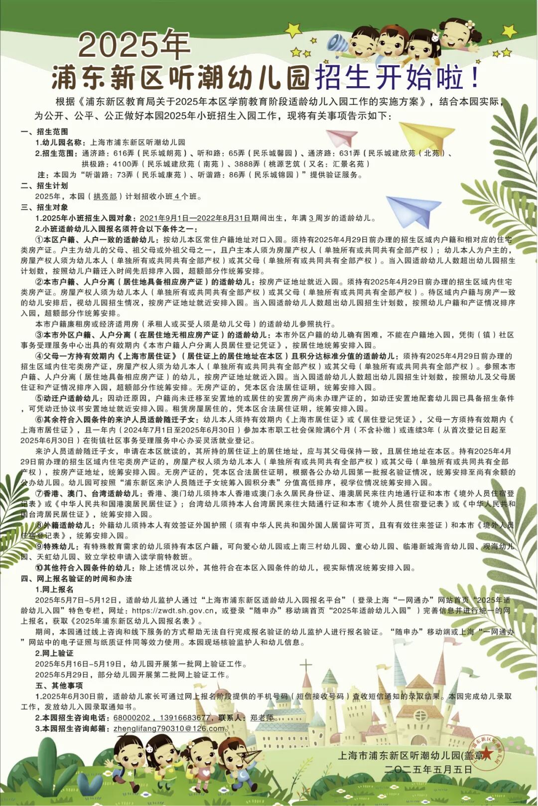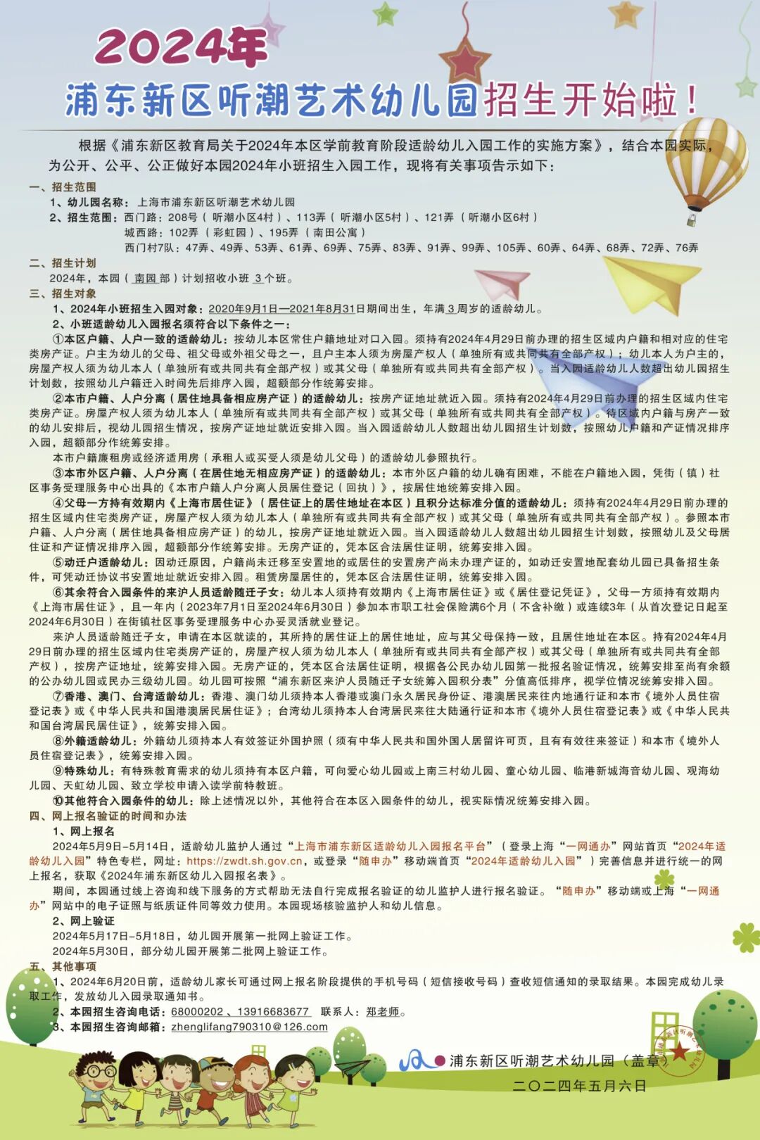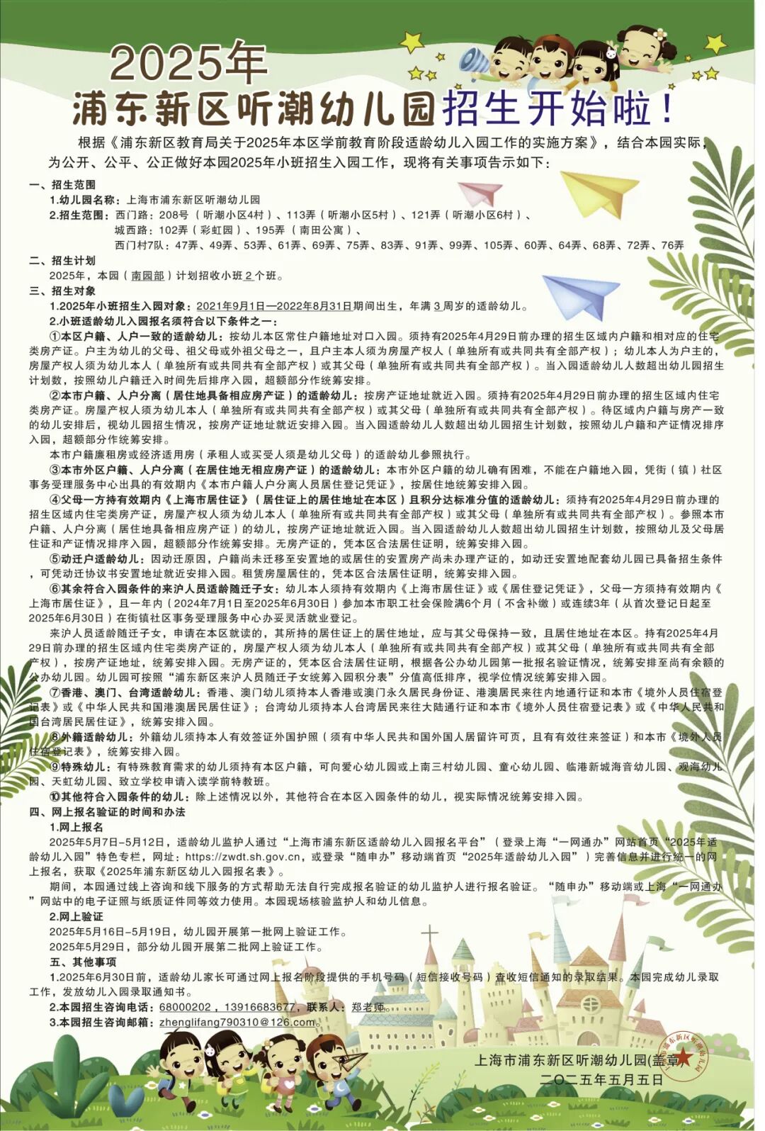香桂部 (点击查看大图) 温馨提示 ✦ 1.相关链接 (1)网上报名:浦东新区适龄幼儿入园报名平台 上海“一网通办”网站(https://zwdt.sh.gov.cn)首页“2023年适龄幼儿入园”特色专栏,及“随申办”移动端首页“2023年适龄幼儿入园”模块将正式开通。 (2)2023年适龄幼儿入园网上登记流程 (点击链接阅读查看) (3)我园线上校园开放日 第481期【家园共育】云游“听艺” ,遇见美好 ——听潮艺术幼儿园云上校园开放日 (点击链接阅读查看) (4)浦东新区民办幼儿园及托育机构信息 ▪2023年浦东新区民办幼儿园信息公示 ▪2023年浦东新区托育机构信息公示 ✦ 2.验证安排 网上验证: 2023年5月17日-5月18日,我园开展第一批网上验证工作。 2023年5月31日,我园开展第二批网上验证工作。 线下验证: 对确因特殊原因未按时办理各类证件的幼儿或登记成功后,确有需要修改信息的家长,请先提前三天进行预约,我们会安排教师开展线下审核验证,请严格按照预约时间,携带相关证件准时来园。 (1)验证时间: 2023年5月17日-5月18日:第一批网上验证 (上午:8:00-11:00;下午:13:00-16:00) 2023年5月31日:第二批网上验证 (上午:8:00-11:00;下午:13:00-16:00) (2)有特殊需求家长,严格按照电话预约时间,携带相关证件准时来园验证。 (3)入园后请耐心在等候区等待,轮到之后进入验证室验证。 (4)请全程佩戴口罩,与他人保持安全距离。 ✦ 3.招生咨询电话 联系人: ▪ 郑老师 13916683677 ▪ 张老师 13482365951 ▪ 办公室咨询电话 68000202