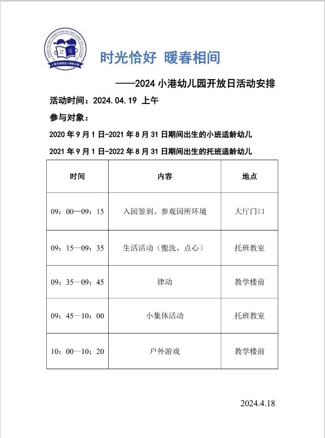 为了更好的为新生家长们“答疑解惑”,我们将邀请您参加2024年4月19日(周五)小港幼儿园校园开放日体验活动。