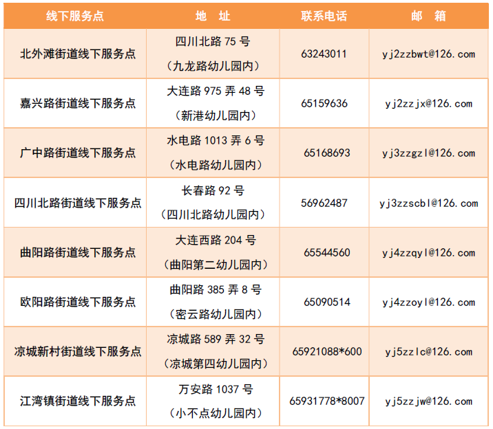 无法自行完成入园信息登记的幼儿监护人,可提前与附近的区线下服务点(见下表)进行电话咨询后,在区线下服务点完成信息登记。