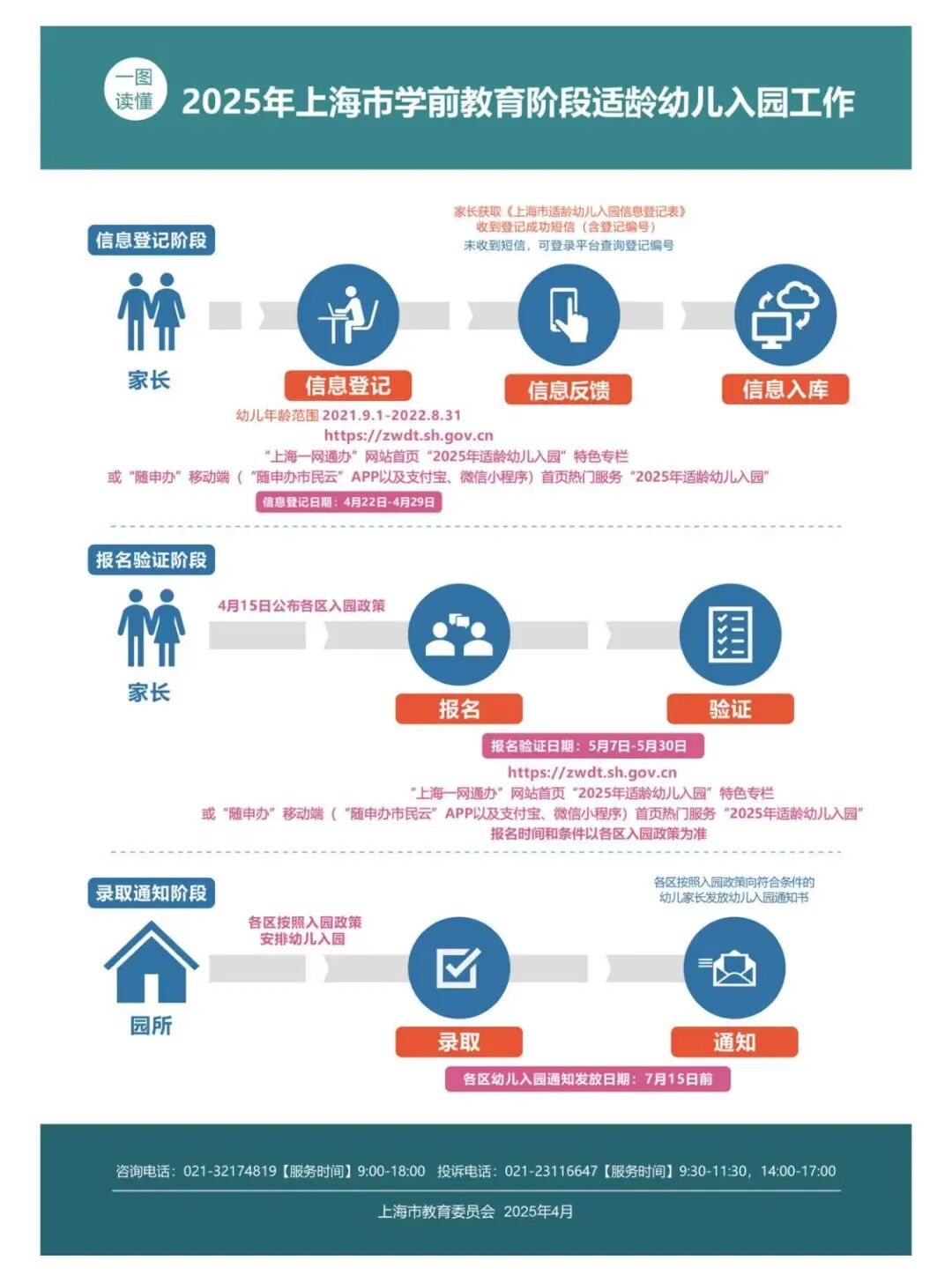 4月7日市教委今天公布了《关于做好2020年本市学前教育阶段适龄幼儿入园工作的通知》,今年全市入园工作分为信息登记、报名验证和录取通知三个阶段。凡本市拟报名入幼儿园小班的适龄幼儿,家长在4月24日-4月30日期间,通过“上海市适龄幼儿入园信息登记系统”先进行网上信息登记。