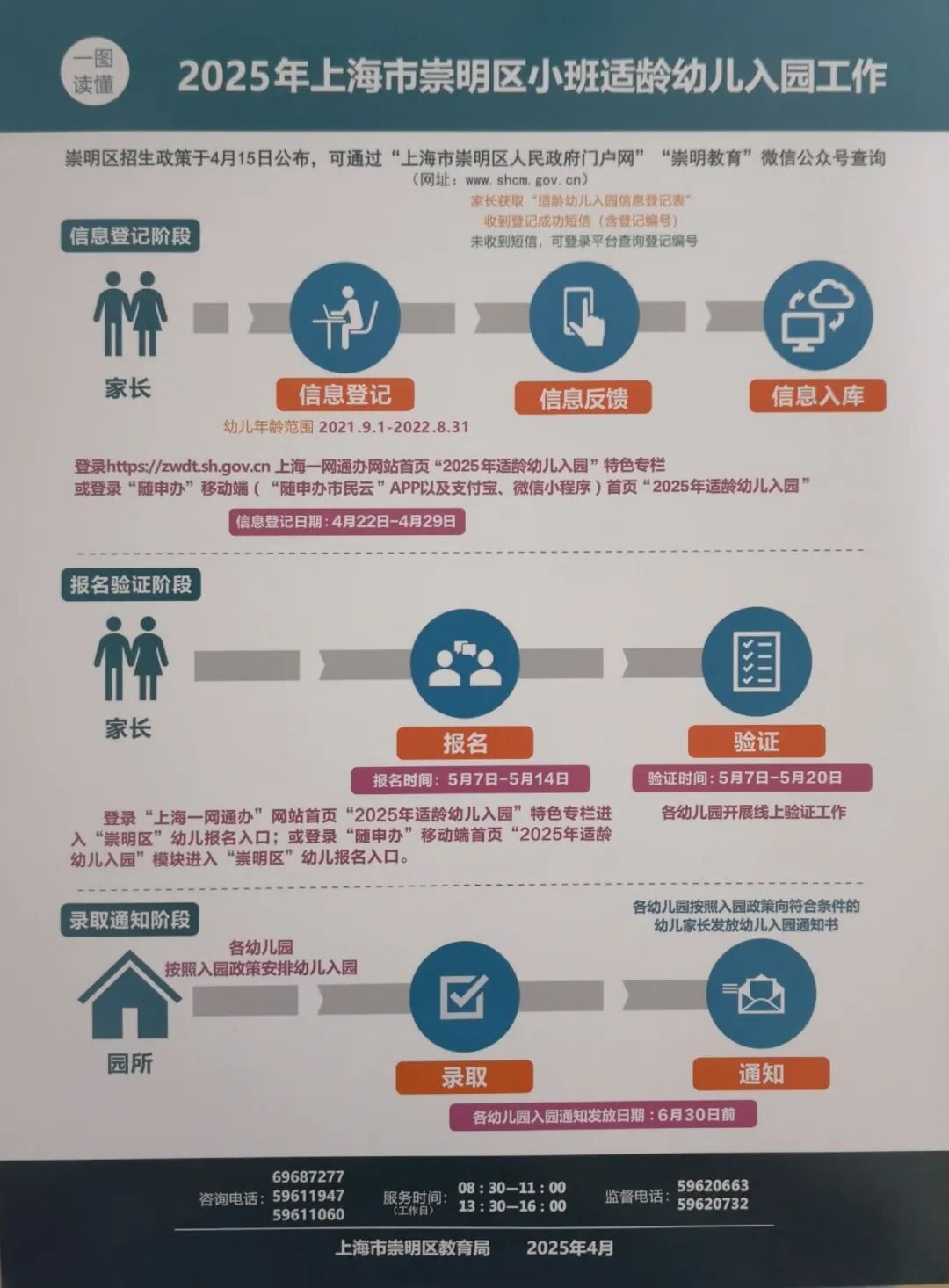 凡拟报名就读本市幼儿园小班的适龄幼儿,须在4月24日—4月30日期间进行网上信息登记。登记完成后家长获取入园信息登记表和登记编号,方可进行入园的报名和验证。崇明区幼儿园报名验证和录取工作仍由崇明区根据本区实际情况来组织各园开展工作。