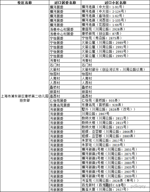 注意:幼儿园托班、中大班插班转园以及外籍人员子女学校的幼儿不在本次入园信息登记对象范围内。 (一)信息登记 1.登记对象 2.登记条件 (1)本市户籍:居民身份证(号); (2)非本市户籍:上海市居住证或上海市居住登记凭证,港澳居民来往内地通行证或港澳居民居住证,台湾居民来往大陆通行证或台湾居民居住证; (3)外籍:护照。 3.信息确认 (1)登记系统内信息与实际情况不符,监护人根据所持证件的信息在系统中修改。 (2)已在本市有关部门登记,但未在登记系统显示信息的幼儿,监护人根据所持证件的信息进行登记。 (3)确因特殊情况未在有关部门登记信息的幼儿,在报名验证阶段在各幼儿园进行信息补登记。登记点现场核验监护人和幼儿信息的准确性。 (二)网上预约 (三)现场验证 适龄幼儿入园报名须符合以下条件之一: 1.本区户籍,户籍与房产一致的适龄幼儿:按幼儿本区常住户籍地址对口入园。须持有2021年4月30日前办理的招生区域内户籍和相对应的住宅类房产证。户主须是父母、祖父母或外祖父母之一,并全部或共同共有产权。幼儿本人为户主的,房产证产权人须为幼儿本人或其父母,并全部或共同共有产权。 2.本市户籍,人户分离的适龄幼儿:按房产证地址就近入园。须持有2021年4月30日前办理的户籍和招生区域内住宅类房产证。房产证产权人须为幼儿父母或其本人,并全部或共同共有产权。待区域内户籍与房产一致的幼儿安排后,视幼儿园招生情况,按房产证地址就近安排入园。 本市户籍廉租房或经济适用房(承租人或买受人须是幼儿父母)的适龄幼儿参照执行。 3.父母一方持有效期内《上海市居住证》(居住证上的居住地址在本区)且积分达标准分值的适龄幼儿:持有2021年4月30日前办理的招生区域内住宅类房产证的(产权人须为幼儿父母或其本人,并全部或共同共有产权),参照本市户籍、人户分离的幼儿,按房产证地址就近安排入园。当入园适龄幼儿人数超出幼儿园招生计划数,按照幼儿及父母居住证和产证情况排序入园,超额部分作统筹安排。 4.动迁户适龄幼儿:因动迁原因,户籍尚未迁移至安置地的或居住的安置房产尚未办理产证的,如动迁安置地配套幼儿园已具备招生条件,可凭动迁协议书安置地址就近安排入园。租赁房屋居住的,凭本区合法居住证明,根据实际居住地址,统筹安排入园。 5.本市外区户籍,在居住地无相应房产证的适龄幼儿:凭本区合法居住证明,根据实际居住地址,统筹安排入园。 6.其余符合条件的来沪人员适龄随迁子女:幼儿本人须持有效期内《上海市居住证》或《居住登记凭证》,父母一方须持有效期内《上海市居住证》,且一年内参加本市职工社会保险满6个月(2020年7月1日至2021年6月30日,不含补缴,因疫情防控需要允许补缴的除外)或连续3年(从首次登记日起至2021年6月30日)在本区街镇社区事务中心办妥灵活就业登记。 7.香港、澳门、台湾适龄幼儿:香港、澳门幼儿须持本人香港或澳门永久居民身份证、港澳居民来往内地通行证和《本市境外人员住宿登记表》或《中华人民共和国港澳居民居住证》;台湾幼儿须持本人台湾居民来往大陆通行证和《本市境外人员住宿登记表》或《中华人民共和国台湾居民居住证》,根据实际居住地址,统筹安排入园。 8.外籍适龄幼儿:外籍幼儿须持本人有效签证外国护照(须有中华人民共和国外国人居留许可页,且有有效往来签证)和《本市境外人员住宿登记表》,根据实际居住地址,统筹安排入园。 9.特殊幼儿:有特殊教育需求的幼儿须持有本区户籍,可到爱心幼儿园或上南三村幼儿园、童心幼儿园、临港新城海音幼儿园、致立学校开设的学前特教班申请入园。 10.其他符合入园条件的幼儿:除上述情况以外,其他符合在本区入园条件的幼儿,视实际情况统筹安排入园。 (四)录取通知 详情请点击下面文字进行查看: 1.@适龄幼儿家长们,上海明天起开始幼儿园入园网上信息登记(附重要时间安排及热门问答) 2.浦东新区教育局关于2021年本区学前教育阶段 适龄幼儿入园工作的实施意见幼儿园(园所)名称 招生对口地段范围 小区名称 上海市浦东新区康桥第二幼儿园