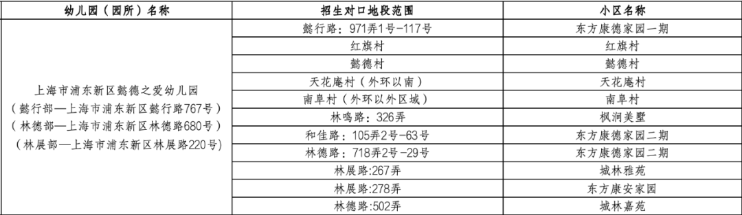 1 2022级 • 小班 2022年浦东新区懿德之爱幼儿园小班招生通告 根据《浦东新区教育局关于2022年本区学前教育阶段适龄幼儿入园工作的实施意见》,结合本园实际,为公开、公平、公正做好本园2022年小班招生入园工作,现将有关事项告示如下: 一、招生范围 1、幼儿园名称: 上海市浦东新区懿德之爱幼儿园 2、招生范围: 懿行部:懿行路971弄1号-117号、和佳路105弄2号-63号、林德路718弄2号-29号、红旗村、懿德村、天花庵村、南阜村(外环以外区域) 林展部:林展路267弄、林展路278弄、林德路502弄 二、招生计划 2022年,本园( 懿行 部)计划招收小班 3 个班。 2022年,本园( 林展 部)计划招收小班 2 个班。 三、招生对象 1.2022年小班招生入园对象:2018年9月1日至2019年8月31日期间出生,年满3周岁的适龄幼儿。 2.小班适龄幼儿入园报名须符合以下条件之一: ①本区户籍、人户一致的适龄幼儿:按幼儿本区常住户籍地址对口入园。须持有2022年6月30日前办理的招生区域内户籍和相对应的住宅类房产证。户主为幼儿的父母、祖父母或外祖父母之一,且户主本人须为房屋产权人(单独所有或共同共有全部产权);幼儿本人为户主的,房屋产权人须为幼儿本人(单独所有或共同共有全部产权)或其父母(单独所有或共同共有全部产权)。当入园适龄幼儿人数超出幼儿园招生计划数,按照幼儿户籍迁入时间先后排序入园,超额部分作统筹安排。 ②本市户籍、人户分离(居住地具备相应房产证)的适龄幼儿:按房产证地址就近入园。须持有2022年6月30日前办理的招生区域内住宅类房产证。房屋产权人须为幼儿本人(单独所有或共同共有全部产权)或其父母(单独所有或共同共有全部产权)。待区域内户籍与房产一致的幼儿安排后,视幼儿园招生情况,按房产证地址就近安排入园。当入园适龄幼儿人数超出幼儿园招生计划数,按照幼儿户籍和产证情况排序入园,超额部分作统筹安排。 本市户籍廉租房或经济适用房(承租人或买受人须是幼儿父母)的适龄幼儿参照执行。 ③本市外区户籍、人户分离(在居住地无相应房产证)的适龄幼儿:本市外区户籍的幼儿确有困难,不能在户籍地入园,凭街(镇)社区事务受理服务中心出具的《本市户籍人户分离人员居住登记(回执)》,按居住地统筹安排入园。 ④父母一方持有效期内《上海市居住证》(居住证上的居住地址在本区)且积分达标准分值的适龄幼儿:须持有2022年6月30日前办理的招生区域内住宅类房产证,房屋产权人须为幼儿本人(单独所有或共同共有全部产权)或其父母(单独所有或共同共有全部产权)。参照本市户籍、人户分离(居住地具备相应房产证)的幼儿,按房产证地址就近入园。当入园适龄幼儿人数超出幼儿园招生计划数,按照幼儿及父母居住证和产证情况排序入园,超额部分作统筹安排。无房产证的,凭本区合法居住证明,统筹安排入园。 ⑤动迁户适龄幼儿:因动迁原因,户籍尚未迁移至安置地的或居住的安置房产尚未办理产证的,如动迁安置地配套幼儿园已具备招生条件,可凭动迁协议书安置地址就近安排入园。租赁房屋居住的,凭本区合法居住证明,统筹安排入园。 ⑥其余符合条件的来沪人员适龄随迁子女:幼儿本人须持有效期内《上海市居住证》或《居住登记凭证》,父母一方须持有效期内《上海市居住证》,且一年内参加本市职工社会保险满6个月(2021年7月1日至2022年6月30日)或连续3年(从首次登记日起至2022年6月30日)在街镇社区事务中心办妥灵活就业登记。2022年因受疫情影响将适度放宽来沪人员随迁子女入园有关条件。 来沪人员适龄随迁子女,申请在本区就读的,其所持的居住证上的居住地址,应与其父母保持一致,且居住地址在本区。持有2022年6月30日前办理的招生区域内住宅类房产证的,房屋产权人须为幼儿本人(单独所有或共同共有全部产权)或其父母(单独所有或共同共有全部产权),按房产证地址,统筹安排入园。无房产证的,凭本区合法居住证明,根据各公民办幼儿园第一批报名验证情况,统筹安排至尚有余额的公办幼儿园或民办三级幼儿园。幼儿园可按照“浦东新区来沪人员随迁子女统筹入园积分表”分值高低排序,视学位情况统筹安排入园。 ⑦香港、澳门、台湾适龄幼儿:香港、澳门幼儿须持本人香港或澳门永久居民身份证、港澳居民来往内地通行证和本市《境外人员住宿登记表》或《中华人民共和国港澳居民居住证》;台湾幼儿须持本人台湾居民来往大陆通行证和本市《境外人员住宿登记表》或《中华人民共和国台湾居民居住证》,统筹安排入园。 ⑧外籍适龄幼儿:外籍幼儿须持本人有效签证外国护照(须有中华人民共和国外国人居留许可页,且有有效往来签证)和本市《境外人员住宿登记表》,统筹安排入园。 ⑨特殊幼儿:有特殊教育需求的幼儿须持有本区户籍,可向爱心幼儿园或上南三村幼儿园、童心幼儿园、临港新城海音幼儿园、致立学校申请入读学前特教班。 ⑩其他符合入园条件的幼儿:除上述情况以外,其他符合在本区入园条件的幼儿,视实际情况统筹安排入园。 四、网上报名验证的时间和办法 1.网上报名 2022年6月24日-6月30日,适龄幼儿监护人须通过上海市浦东新区适龄幼儿入园报名平台(登录“上海一网通办”网站首页“2022年适龄幼儿入园”特色专栏,网址:https://zwdt.sh.gov.cn,或登录“随申办”移动端首页“2022年适龄幼儿入园