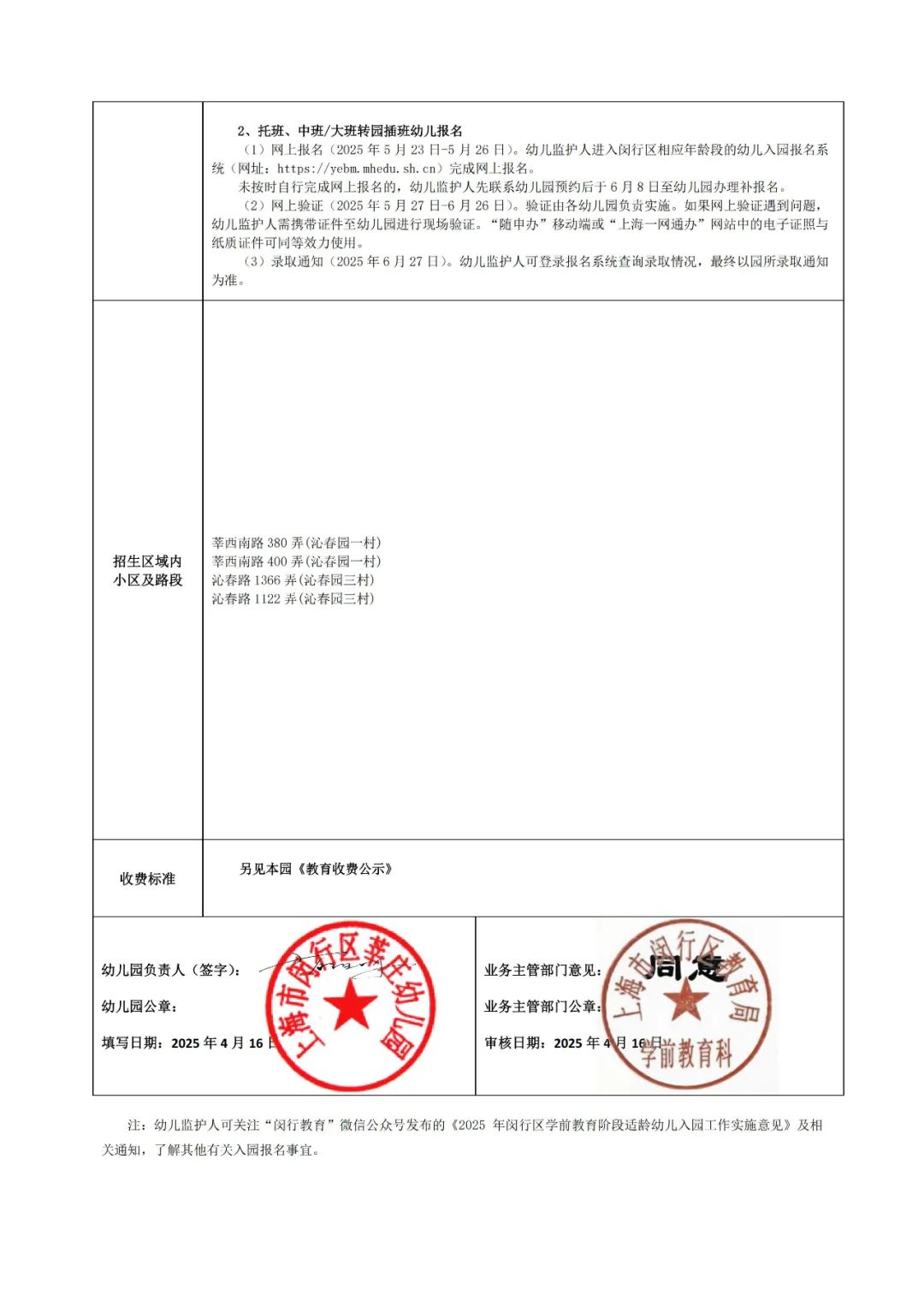 上海市闵行区莘庄幼儿园 ●办学等级 上海市示范性幼儿园 ●幼儿园地址 沁春园区(沁春路二村38号) 中春园区(沁春园三村79号) 平阳园区(平阳四街坊173号) ●办学类型 全日制 ●招生问题咨询 54950008(工作日9:00-11:30,13:30-16:30) 招生区域 沁春园区(沁春园二村38号) 沁春园二村 莘西南路155弄 莘春景苑 莘西南路99弄 三春汇秀苑 沁春路355弄 美丽家园 莘西南路128弄 中春园区(沁春园三村79号) 沁春园一村 莘西南路380弄 莘西南路400弄 沁春园三村 沁春路1122弄 沁春路1366弄 平阳园区(平阳四街坊173号) 平阳二村 顾戴路1075弄 平阳三街坊 平阳路1375弄 龙茗路701弄 平阳四街坊 古美西路628弄 平阳绿家园 古美西路631弄 招生对象 2018年9月1日-2019年8月31日出生(包括在园托班幼儿),并且已在市登记系统完成网上信息登记、获取登记编号的幼儿。 招生条件 持有的相关证件/证明材料(包括幼儿户口簿、实际居住在闵行区的有效居住证明、《上海市居住证》/《上海市居住登记凭证》等)的变动(登记)时间为 2022年4月15日之前、身体健康(无慢性传染病)、智力正常、能正常参加集体活动,并符合以下报名条件的适龄幼儿。 户口所在地对口: 2018年9月1日-2019年8月31日出生(包括在园托班幼儿),并且已在市登记系统完成网上信息登记、获取登记编号的幼儿。 居住地对口: (1)持有招生区域内住宅类产权证(产权人是父母或幼儿本人,且全部或共同共有)的本市户籍幼儿。 (2)持有招生区域内经适房产权证(产权人是父母或幼儿本人,且全部或共同共有)的本市户籍幼儿。 (3)持有招生区域内住宅类产权证(产权人是父母或幼儿本人,且全部或共同共有),并且幼儿本人及父母一方持有《上海市居住证》/《上海市居住登记凭证》(有效期内,居住地址与产权证地址一致)的外省市户籍幼儿。 (4)持有招生区域内住宅类产权证(产权人是父母或幼儿本人,且全部或共同共有),并且持有港澳居民来往内地通行证/港澳居民居住证、台湾居民来往大陆通行证/台湾居民居住证的港、澳、台幼儿。 报名流程 (1)网上信息登记 2022年6月9日-6月16日,小班适龄幼儿(包括在园托班幼儿)监护人通过上海市适龄幼儿入园信息登记系统(以下简称“市登记系统”,登录“上海一网通办”网站首页“2022年适龄幼儿入园”特色专栏,网址: https://zwdt.sh.gov.cn,或登录“随申办”移动端首页“2022年适龄幼儿入园”)完成网上信息登记,获取登记编号。具体操作步骤和方法依据市级要求。 (2)网上报名 2022年6月27日-7月1日,小班适龄幼儿(包括在园托班幼儿)监护人通过闵行区小班幼儿入园报名系统(以下简称“区小班报名系统”,按原途径登录市登记系统后点击进入闵行区报名入口,或登录“上海一网通办”网站闵行区首页,网址: https://zwdt.sh.gov.cn/govPortals/region/SH00MH,进入“2022年适龄幼儿入园”专栏,或登录“随申办”移动端首页搜索“闵行旗舰店”进入“幼儿入园”)完成网上报名。 (3)网上验证 完成网上报名的幼儿自动进入第一批验证阶段。2022年7月9日-7月13日,幼儿园完成第一批网上验证。“随申办”移动端或“上海一网通办”网站中的电子证照与纸质证件可同等效力使用。 (4)录取通知 验证通过的幼儿自动进入录取阶段。2022年8月12日,幼儿监护人登录区小班报名系统查询录取情况。遵循人户一致优先的原则,依据区小班报名系统中幼儿入园条件排序情况、幼儿实际报名情况及街镇、幼儿园资源配置情况,完成幼儿录取工作。 确有困难未能按时完成市网上信息登记、区网上报名的幼儿监护人可至闵行区线下服务点完成补登记、补报名。为落实疫情防控工作要求,线下服务点实施预约制。幼儿监护人可及时关注“闵行教育”微信公众 号发布的相关通知或拨打闵行区招生咨询电话,及时了解线下服务点的服务时间、预约方式、防疫要求等信息。 验证时间 第一批网上验证:7月9日-7月13日 如果网上验证遇到问题,幼儿园会与幼儿监护人联系,请保持手机畅通,线下验证需按疫情防控要求进行。验证期间,幼儿监护人有任何疑问,可直接电话咨询幼儿园。 第二批网上验证:7月30日-8月2日 未选择报名符合对口报名条件的公办幼儿园或民办幼儿园“小区生”,又未通过民办幼儿园“非小区生”或全区招生民办幼儿园第一批网上验证的幼儿,自动参加公办幼儿园或民办幼儿园“小区生”的第二批网上验证。部分已及时完成补报名的幼儿,自动参加第二批网上验证。