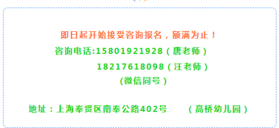 你好, 新同学 我园创办于2011年,园内场地开阔,开设班级有大班、中班、小班。提供轻松健康的环境,玩中学,学中玩。大型玩具齐全,教室宽阔明亮、冬暖夏凉,有空调、各类活动室等教室设备一应俱全。几年来,在区镇府、局党委的正确指导下,与我们牵手公办园学习,参与教研活动、培训活动、优秀的教师队伍也给我园带来了前进动力。 办园思想 我园办园宗旨:“为了孩子的一切,一切为了孩子”。以培养“健康活泼,好奇探究,文明乐群”有初步责任感的健康快乐的儿童。 园所风采 招生对象 我园面向社会招收3—6周岁的身体健康(无慢性传染病),身心发育指标达到同龄儿童基本水平,能独立参加集体活动的适龄幼儿。 小班:2019年9月1日—2020年8月31日 中班:2018年9月1日—2019年8月31日 大班:2017年9月1日—2018年8月31日 各年龄段名额有限哦! 家长们速来咨询和报名呀! 招生时间 即日起开始接受咨询报名,额满为止! 咨询电话:15801921928(唐老师) 18217618098(汪老师) 地址:上海奉贤区南奉公路420号(高桥幼儿园) 小班新生 1、网上登记 4月20日12:00——4月27日 有意愿申请就读本园的适龄幼儿家长,须通过“市登记系统”进行统一的信息登记方式:登录上海 “一网通办”(网址:https://zwdt.sh.gov.cn),进入“2023年适龄幼儿入园”特色专栏,或手机登录“随申办市民云”APP首页“2023年适龄幼儿入园信息登记”专栏,进行统一的信息登记并获取《上海市适龄幼儿入园信息登记表》和登记编号,登记编号作为幼儿进行区级入园报名和验证的凭证,信息填写必须保证真实准确。同时可点击“奉贤区”查询本区相关政策。 2、网上报名 5月8日8:00——5月15日 适龄幼儿监护人须登录上海“一网通办”(网址:https://zwdt.sh.gov.cn),进入“2023年适龄幼儿入园”特色专栏,或手机登录“随申办市民云”APP首页“2023年适龄幼儿入园信息登记”专栏,点击“各区报名”,选择“奉贤区”进行操作。或者登录上海“一网通办”(网址:https://zwdt.sh.gov.cn),选择“政务服务”,切换至“奉贤区”,进入“2023年奉贤区适龄幼儿入园”专栏,或手机登录“随申办市民云”APP,进入“2023年奉贤区适龄幼儿入园”专栏进行操作。 让每个孩子成为独一无二的自己 这里 是孩子们的天地 这里 有童年的故事 每一个孩子 都是独一无二的天使 每一个灵动的生命 都需要有爱的陪伴 高桥幼儿园 欢迎小朋友的到来!