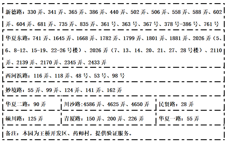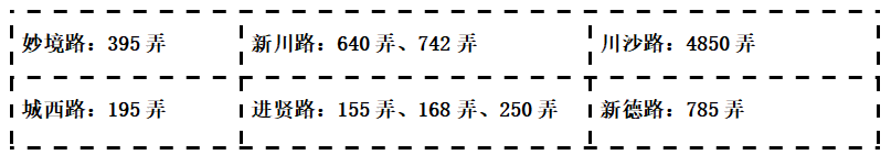 观潮,城西,西门南北村,永凤,怡祥居,老滧港施翘河渔村,新德路378-386号、440弄,华夏东路2110弄、2170弄、2139弄、741弄,川沙路4586弄、4650弄,新德路330弄、341弄、365弄,西河浜路116弄、118弄、48号、53号、98号,川沙路4625弄,华夏东路2026弄、2345弄,新德路604弄、761号,民贤路28弄,新德路735弄、681弄、502弄、506弄、588弄、558弄、602弄,妙境路55弄、99弄、141弄,川北路1891弄,华夏一路55弄,华夏东路1782弄、1801弄、1668弄、1881弄、1799弄、16,