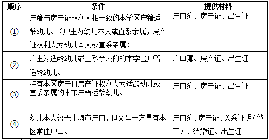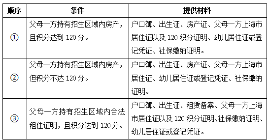 人户一致。户主及房产证权利人为幼儿本人或直系亲属。 户主为适龄幼儿或直系亲属 房产证权利人为适龄幼儿或直系亲属 幼儿本人暂无上海市户口,但父母一方具有本区常住户口 父母一方持有效期内上海市公安局统一签发的《上海市居住证》且积分达到120分标准分值,并持有招生区域内房产或具合法租住证明,幼儿持有效期内《上海市居住证》或《居住登记凭证》 父母一方持有效期内《上海市居住证》,且一年内参加本市职工社会保险满6个月(2019年7月1日至2020年6月30日,不含补缴),或连续3年(从首次登记日起至2020年6月30日)在街镇社区事务受理服务中心办妥灵活就业登记,并持有招生区域内房产或具合法租住证明,幼儿持有效期内《上海市居住证》或《居住登记凭证》 港、澳、台地区及外籍幼儿。法定监护人在本区合法任职或就业、并已在本区购房或合法租住。