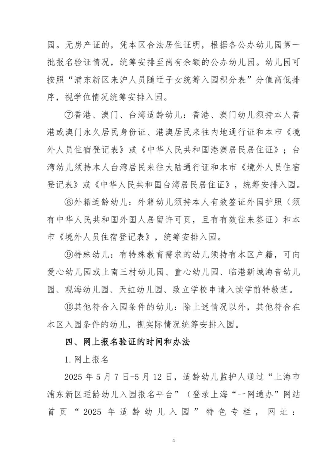 ⑦香港、澳门、台湾适龄幼儿:香港、澳门幼儿须持本人香港或澳门永久居民身份证、港澳居民来往内地通行证和本市《境外人员住宿登记表》或《中华人民共和国港澳居民居住证》;台湾幼儿须持本人台湾居民来往大陆通行证和本市《境外人员住宿登记表》或《中华人民共和国台湾居民居住证》,统筹安排入园。