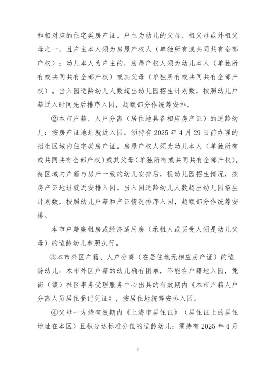 ②本市户籍、人户分离(居住地具备相应房产证)的适龄幼儿:按房产证地址就近入园。须持有2023年4月27日前办理的招生区域内住宅类房产证。房屋产权人须为幼儿本人(单独所有或共同共有全部产权)或其父母(单独所有或共同共有全部产权)。待区域内户籍与房产一致的幼儿安排后,视幼儿园招生情况,按房产证地址就近安排入园。当入园适龄幼儿人数超出幼儿园招生计划数,按照幼儿户籍和产证情况排序入园,超额部分作统筹安排。