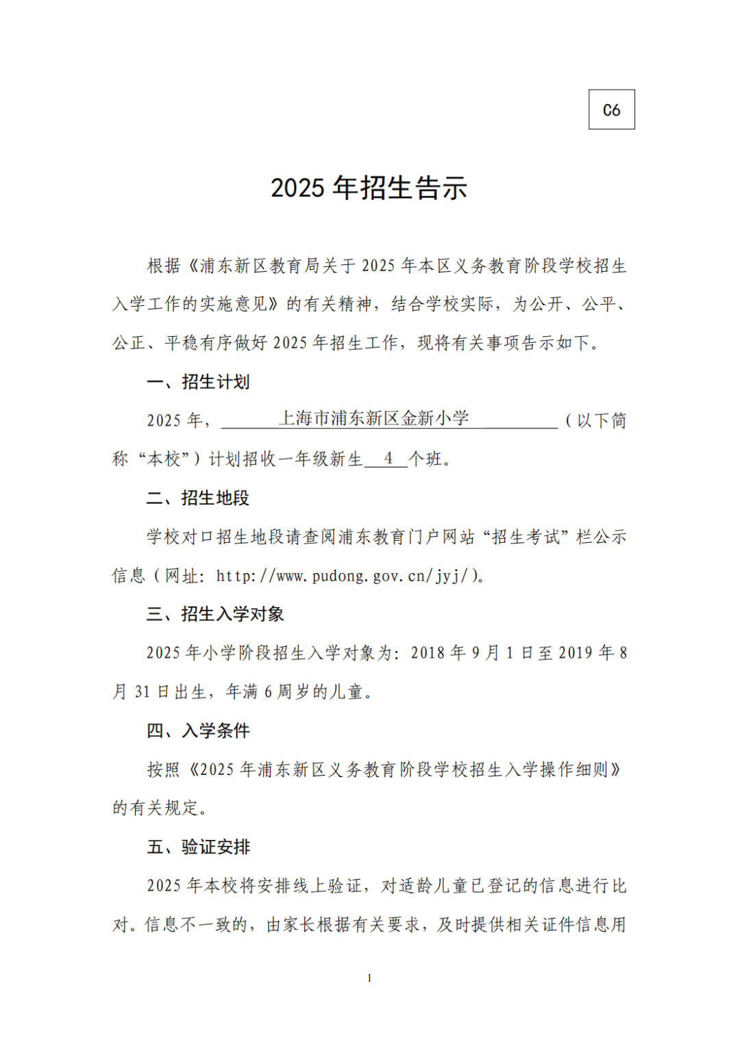 2021 年,上海市浦东新区金新小学(以下简称“本校”)计划招收一年级新生5个班。