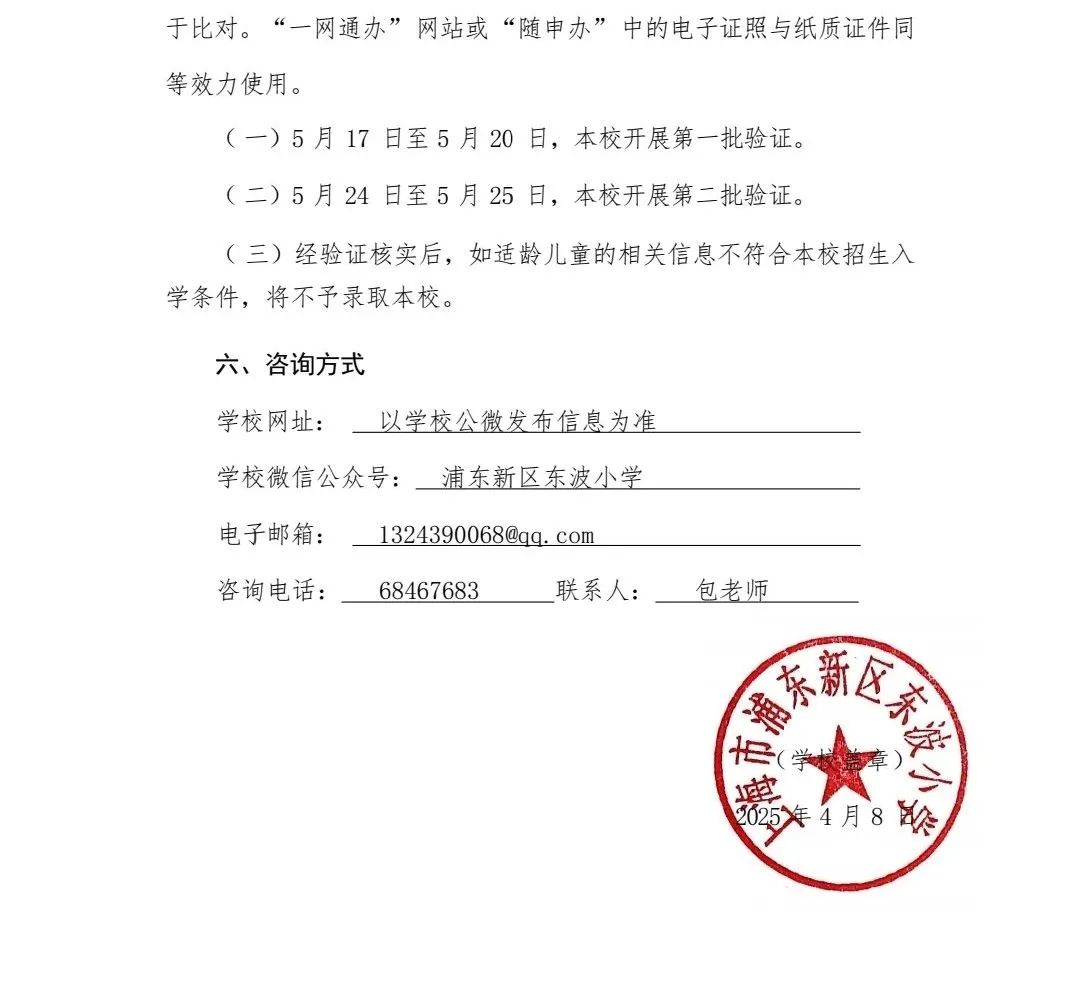 5月20日起,将通过短信和“上海市义务教育入学报名系统”陆续告知相关入学信息。民办学校于5月27日完成招生工作,学校将录取名单报招办。